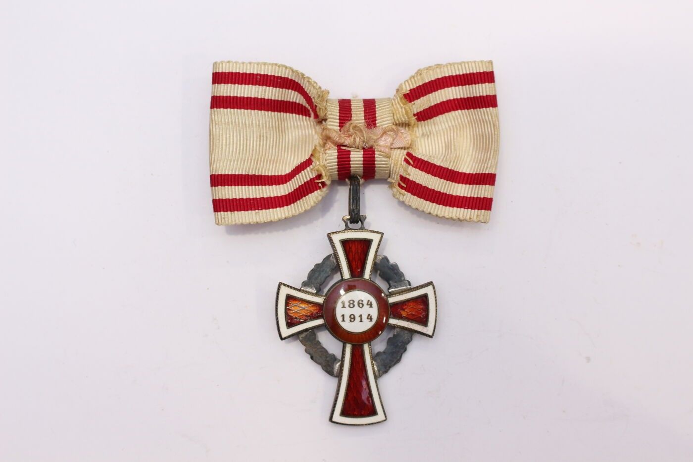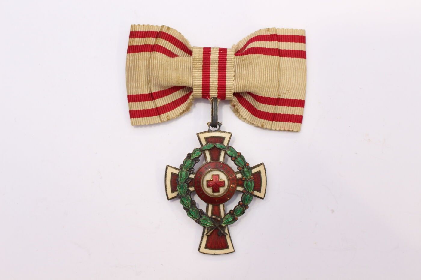 AUSTRIA-HUNGARY. Red Cross merit badge 3rd class with war decoration in minimum silver 800°/°°, enamel and bow ribbon. Gross weight: 21.9 g. (Missing enamel on reverse).