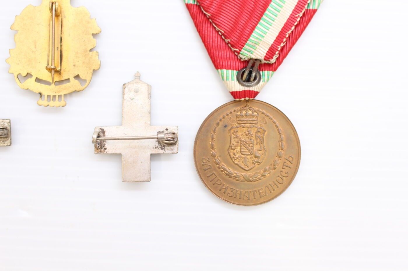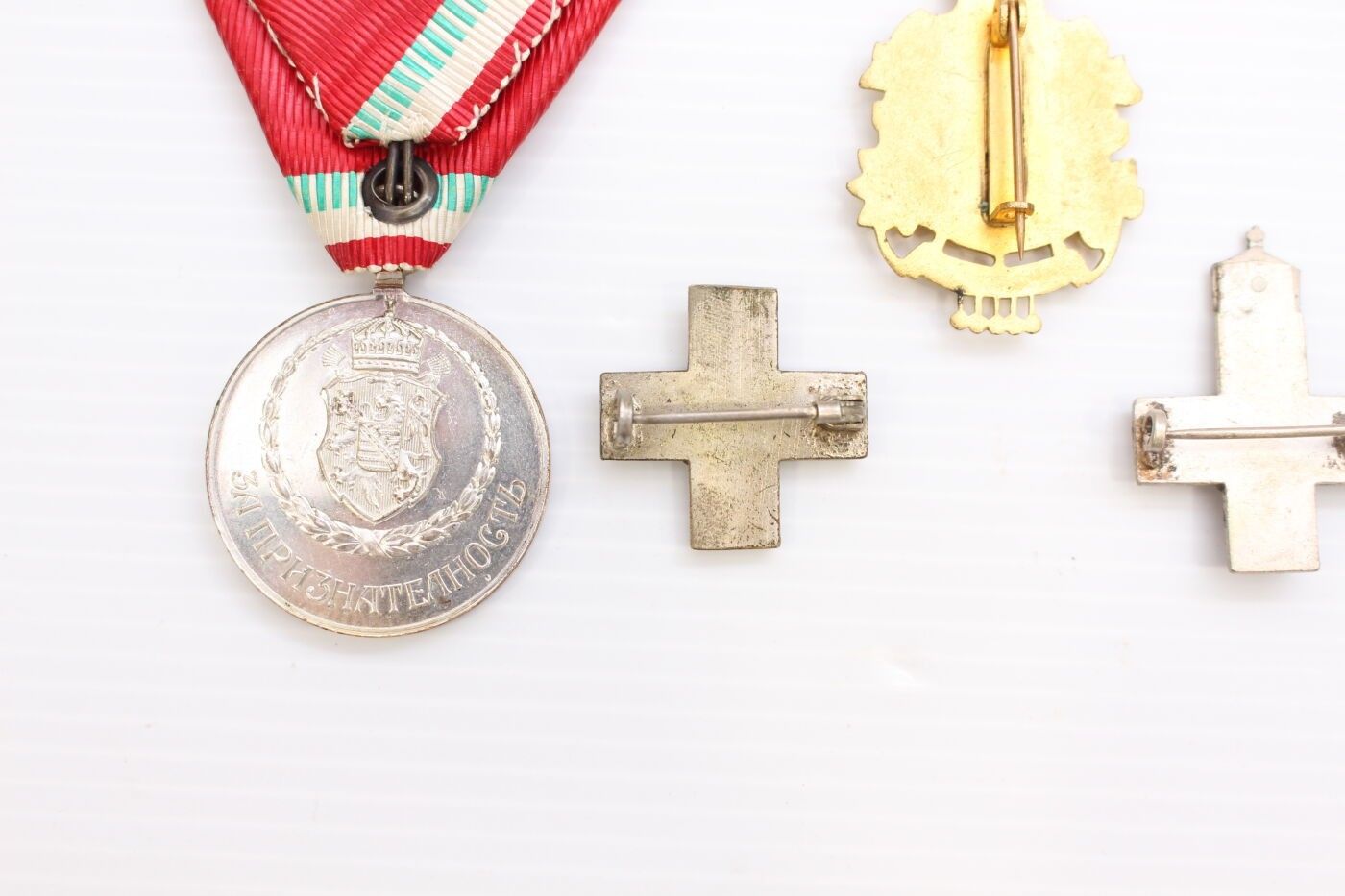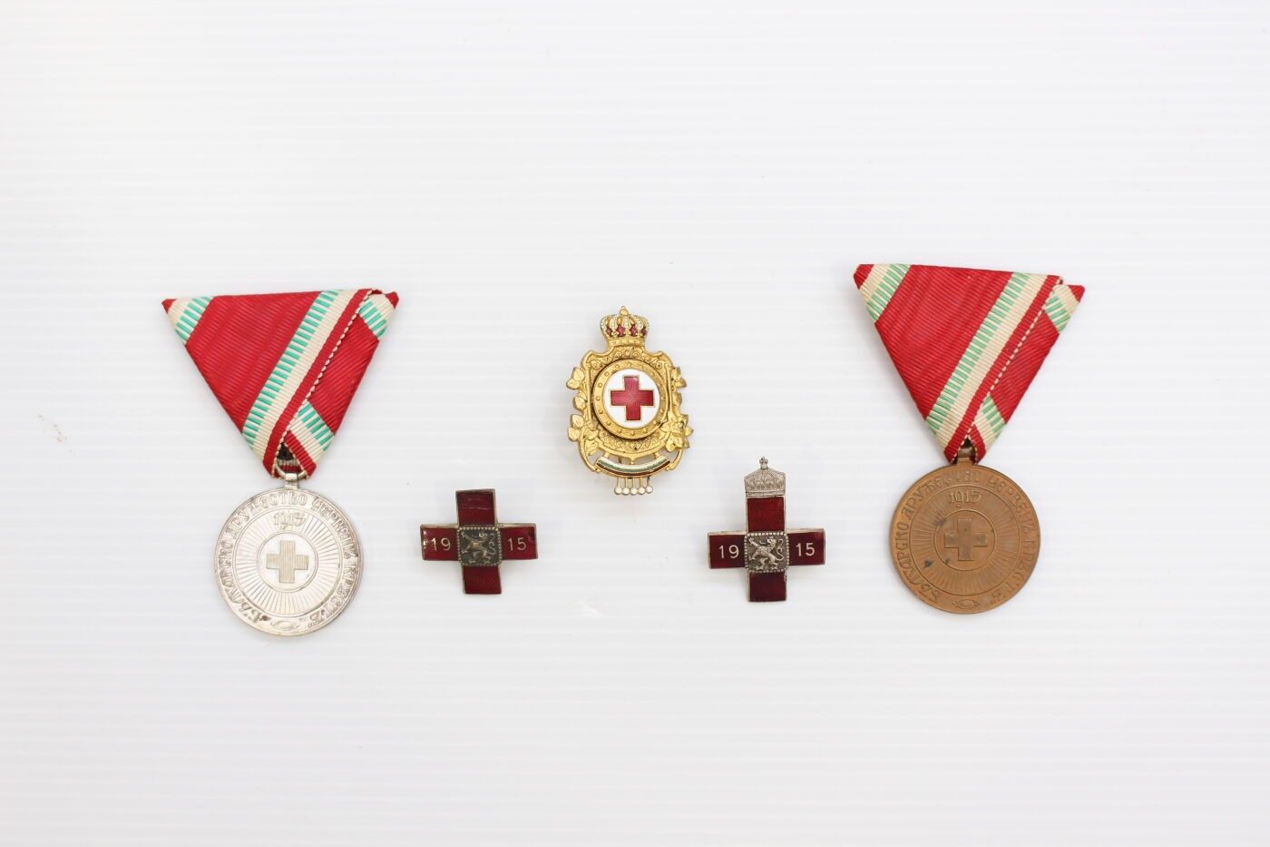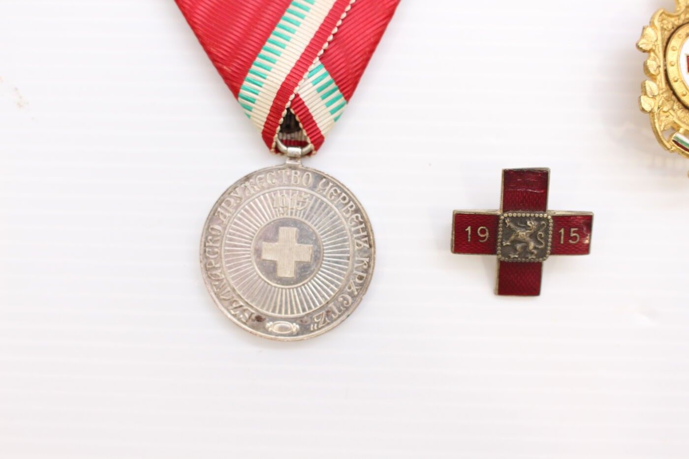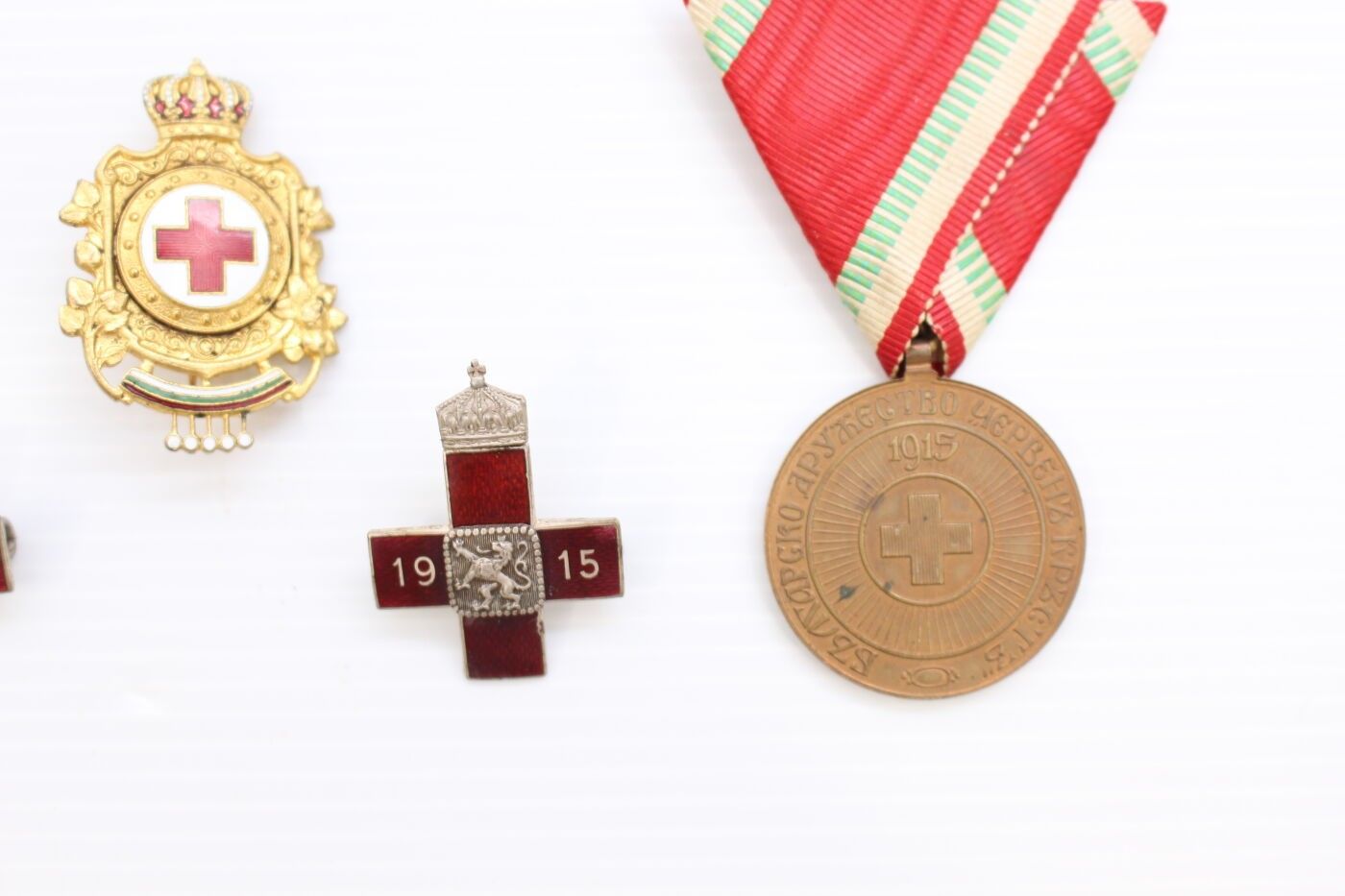BULGARIA. Set of five items including: a silver-plated bronze red cross medal and ribbon; a bronze red cross medal and ribbon; two silver-plated metal and enamel red cross pins, one with crown; a gilt metal and enamel red cross badge. 20th century. Various sizes.