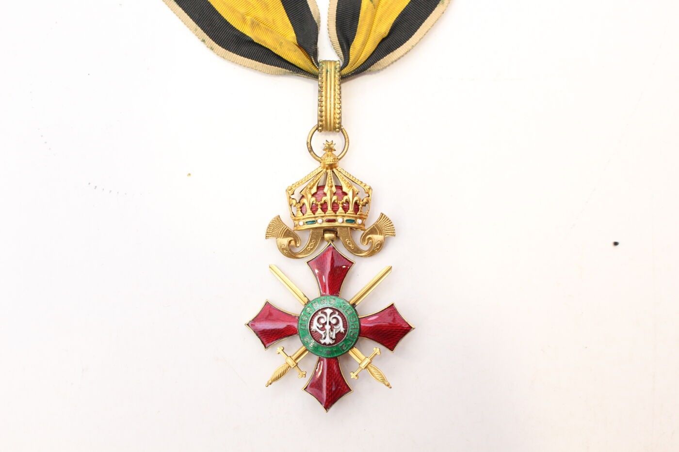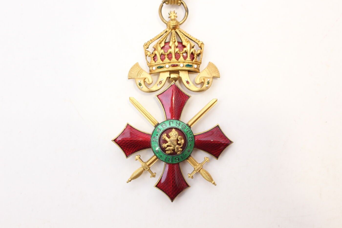 BULGARIA. Order of Military Merit. Gilt bronze commander's badge, enamel and ribbon tie.