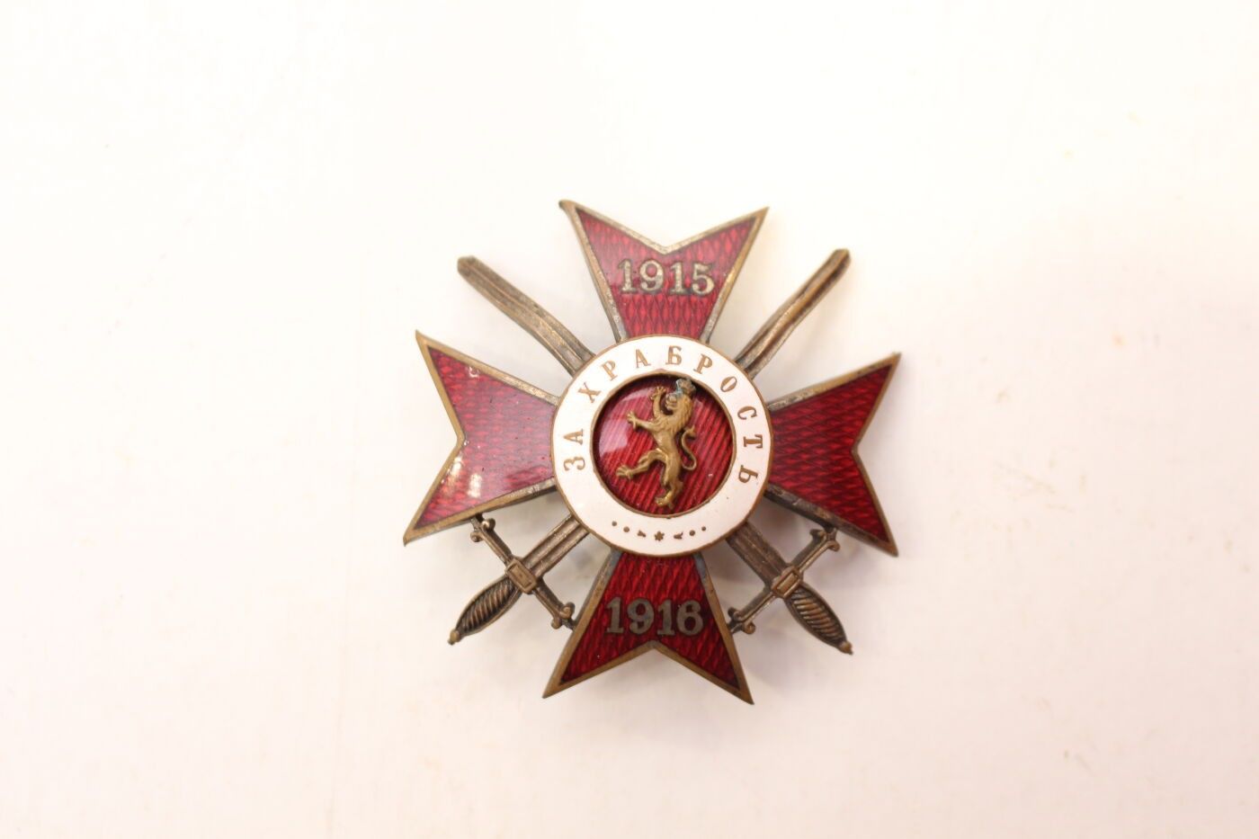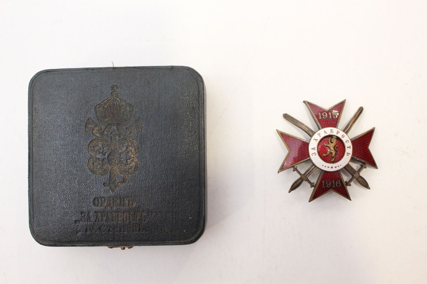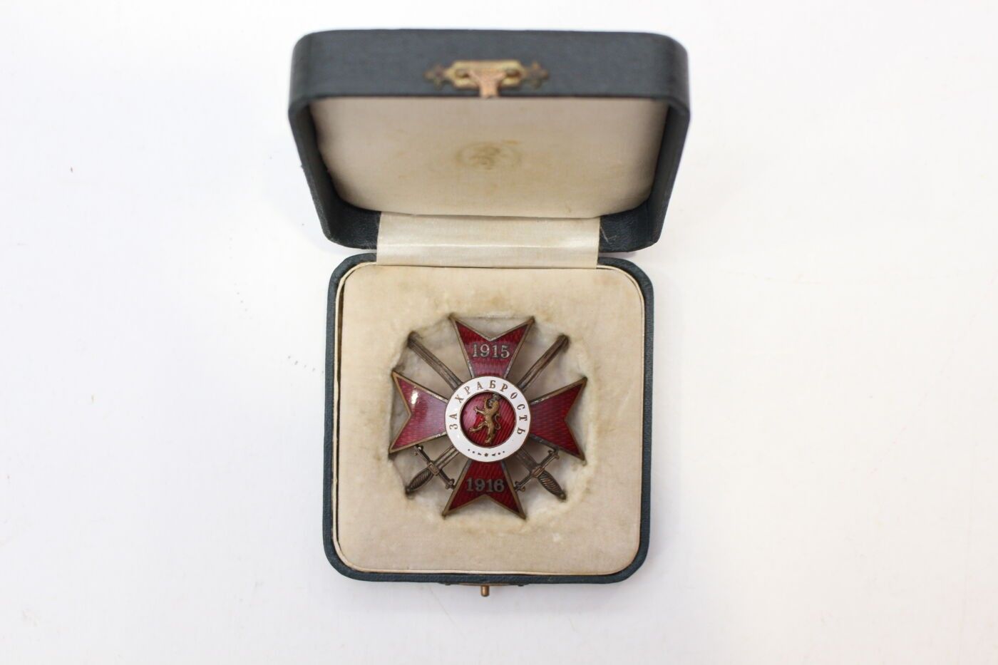 BULGARIA. Cross of Bravery. Badge of 4th class, 1st grade, type 1915/1916 in bronze and enamel. In its original case identified with the Royal Cipher.