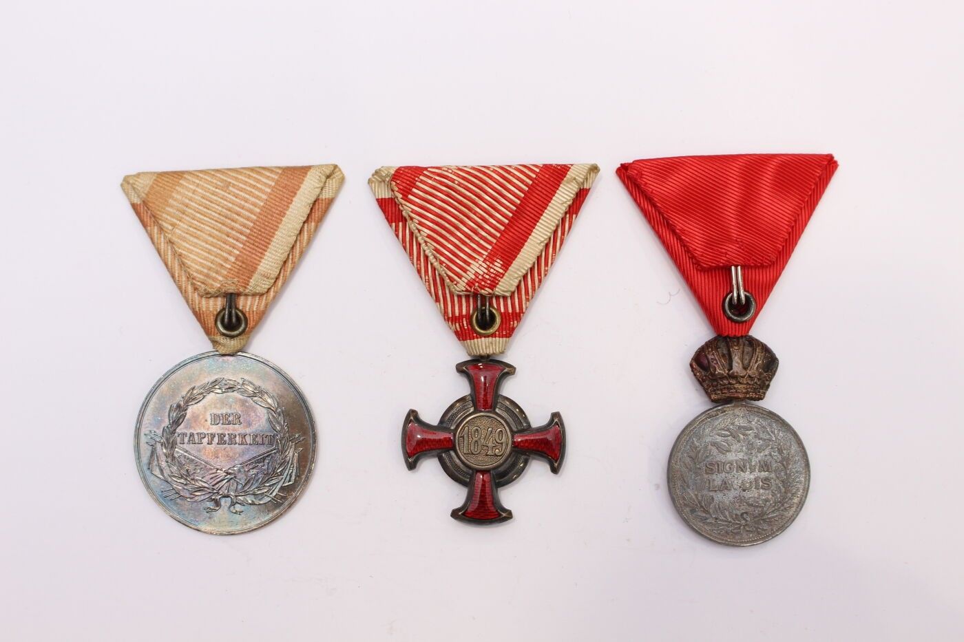 AUSTRIA-HUNGARY. Set of three items comprising: silver medal of 1st class for bravery of 1st type in silver 800°/°° and ribbon; bronze medal of military merit of 1st type in silvered bronze and ribbon; silver cross of merit in silvered bronze, enamel and ribbon with swords. Gross weight: 19.6 g.