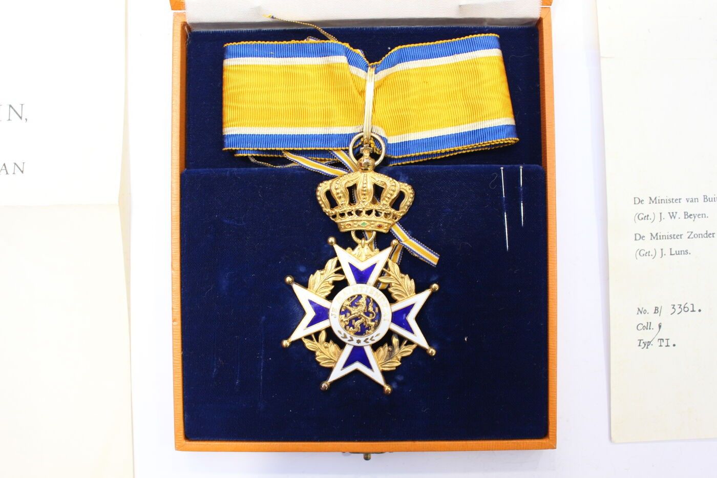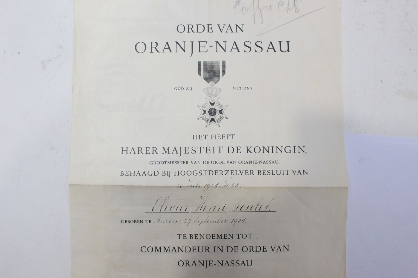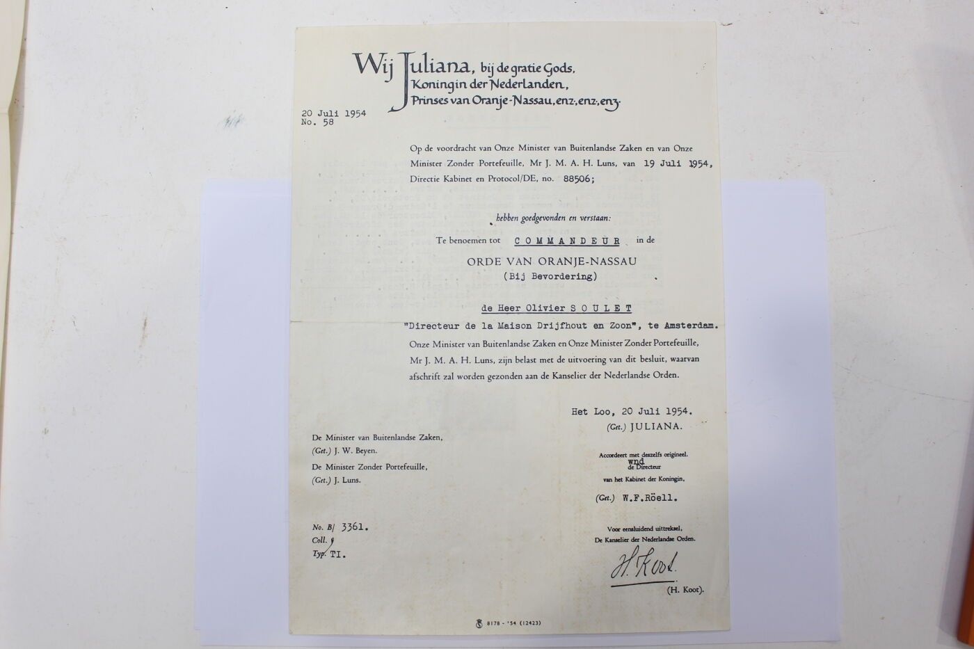 NETHERLANDS. Order of Orange-Nassau. Commander's badge in 585°/°° gold, enamel and tie ribbon. Preserved in its original case lined with orange leather in the style of Jacques Schulman in Amsterdam, inside blue velvet and cream moiré silk velvet. With its award diploma in the name of Mr Olivier Henri SOULET dated 26 August 1954, the booklet of the order's statutes and all related documentation, including letters informing the recipient of his appointment, press articles, an invitation to a gala dinner at which he was awarded the order, a photograph of the recipient, etc. Dutch hallmarks. Gross weight: 35.6 g. (Missing enamel on the reverse listel).