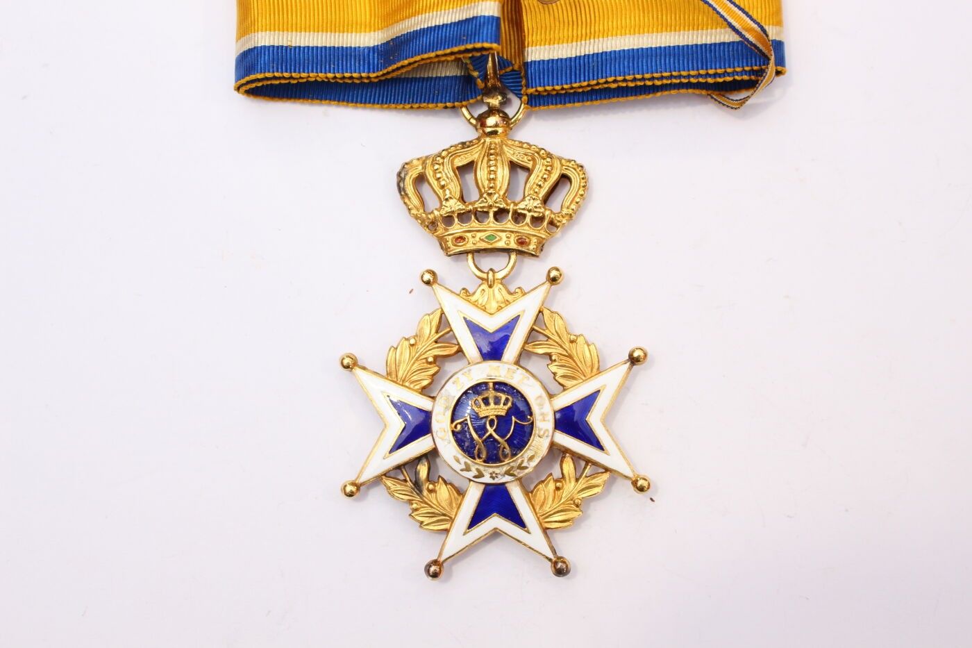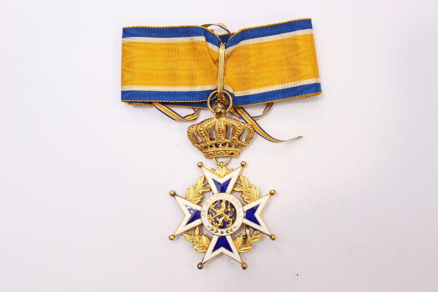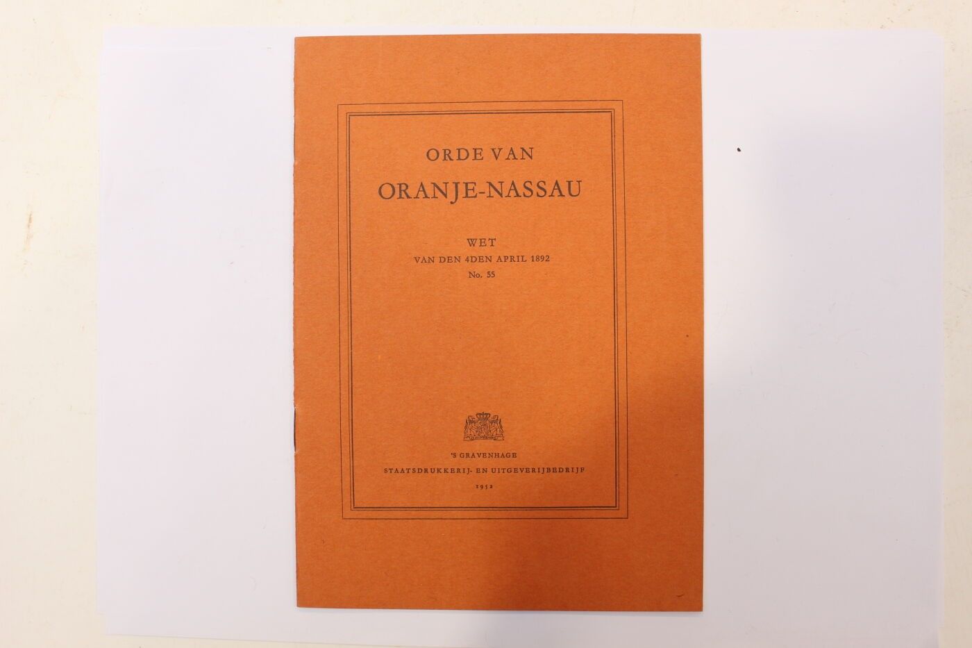 NETHERLANDS. Order of Orange-Nassau. Commander's badge in 585°/°° gold, enamel and tie ribbon. Preserved in its original case lined with orange leather in the style of Jacques Schulman in Amsterdam, inside blue velvet and cream moiré silk velvet. With its award diploma in the name of Mr Olivier Henri SOULET dated 26 August 1954, the booklet of the order's statutes and all related documentation, including letters informing the recipient of his appointment, press articles, an invitation to a gala dinner at which he was awarded the order, a photograph of the recipient, etc. Dutch hallmarks. Gross weight: 35.6 g. (Missing enamel on the reverse listel).