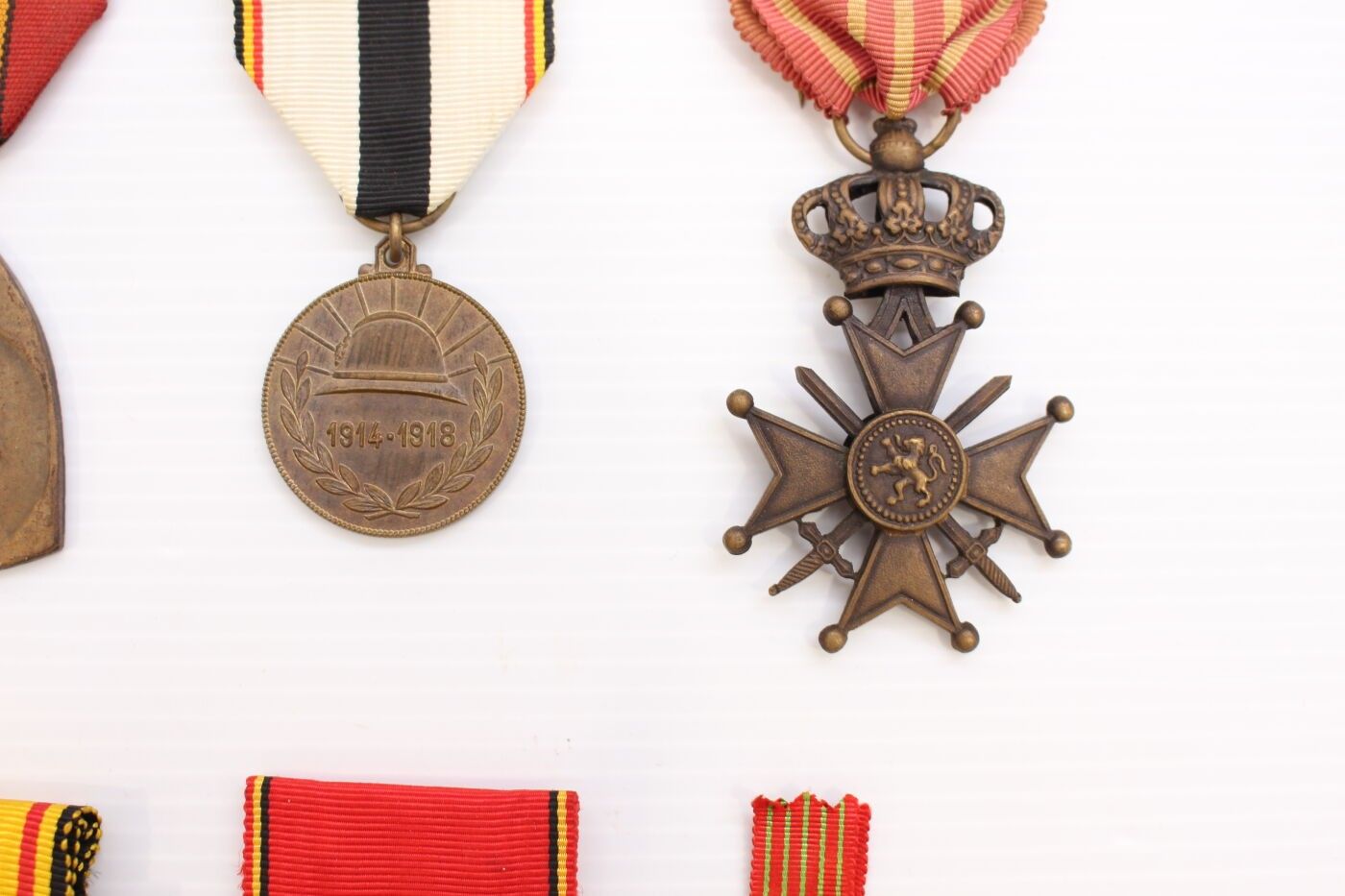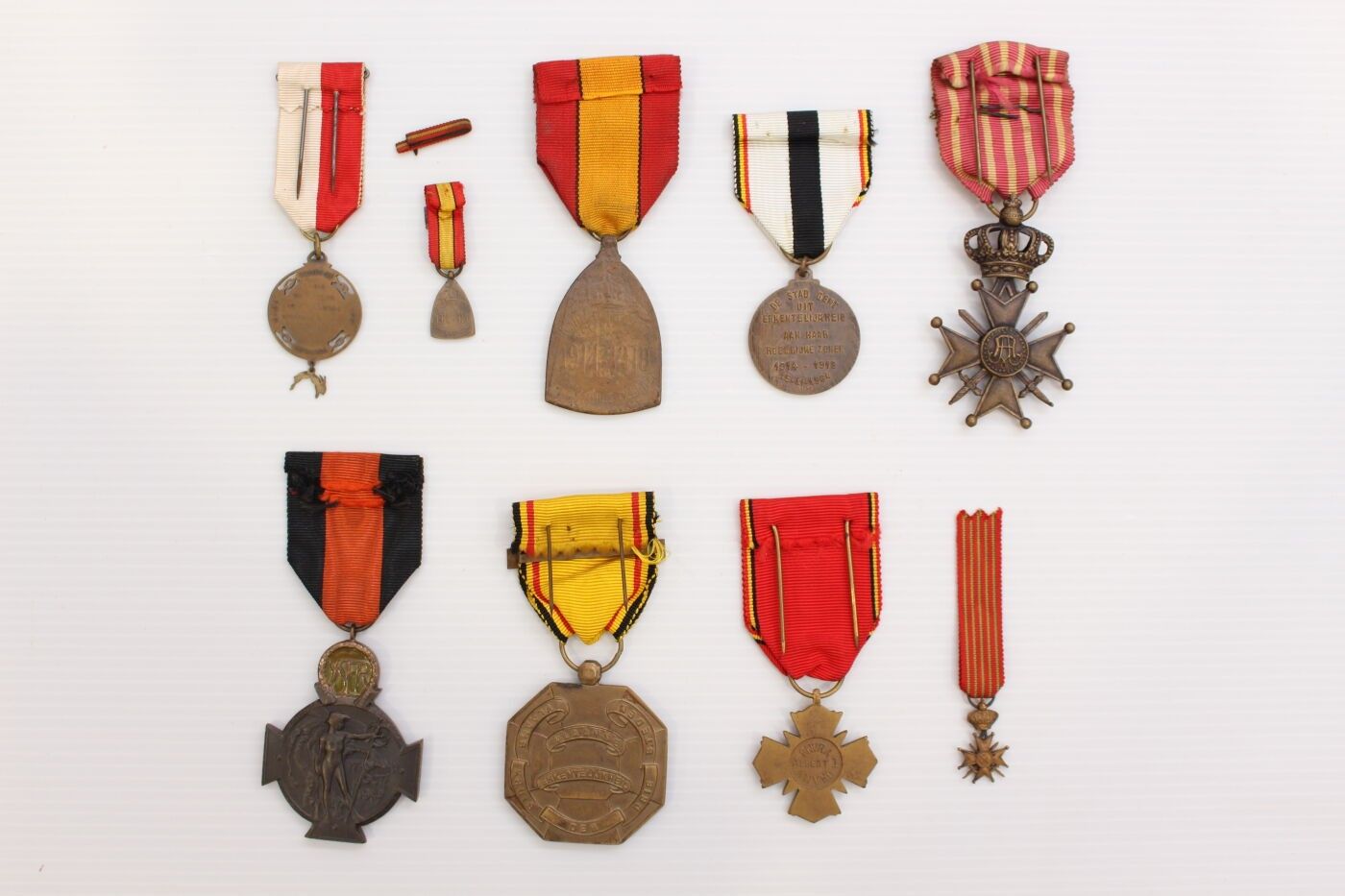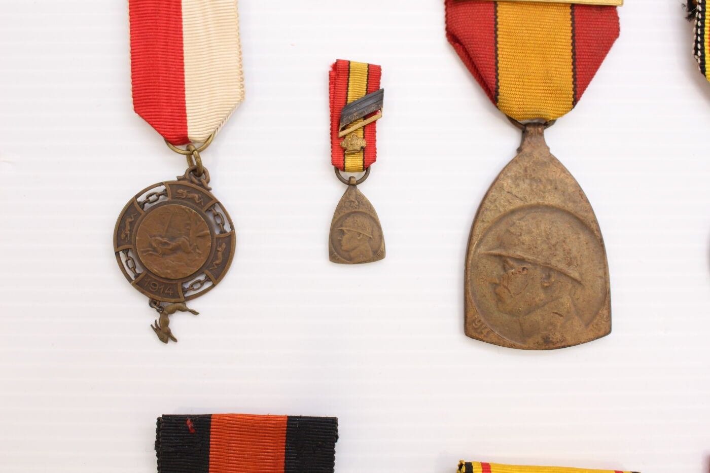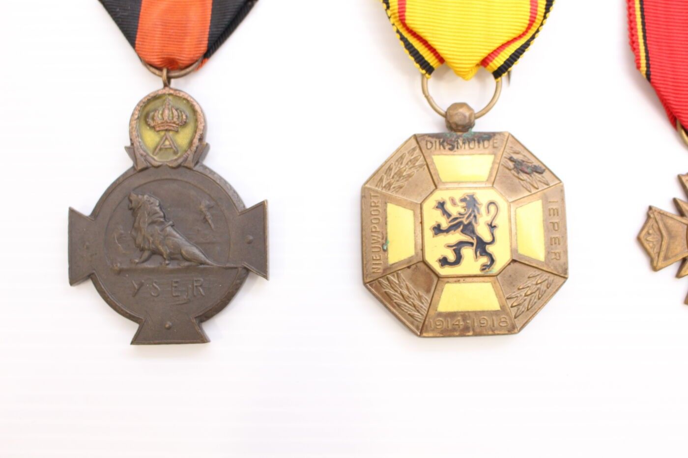 BELGIUM. Set of nine items including: Commémorative 1e GM en bronze et ruban avec sa miniature et sa Dixmude; Croix de guerre 1e GM en bronze et ruban avec sa miniature; médaille des anciens combattants en bronze et ruban; croix du lièvre en bronze et ruban; médaille de l'Yser en bronze et ruban; médaille des Trois cités en bronze, émail et ruban avec barrette Diksmuide; une commémorative de la 1e GM en bronze argenté et ruban. Early 20th century. Various sizes.