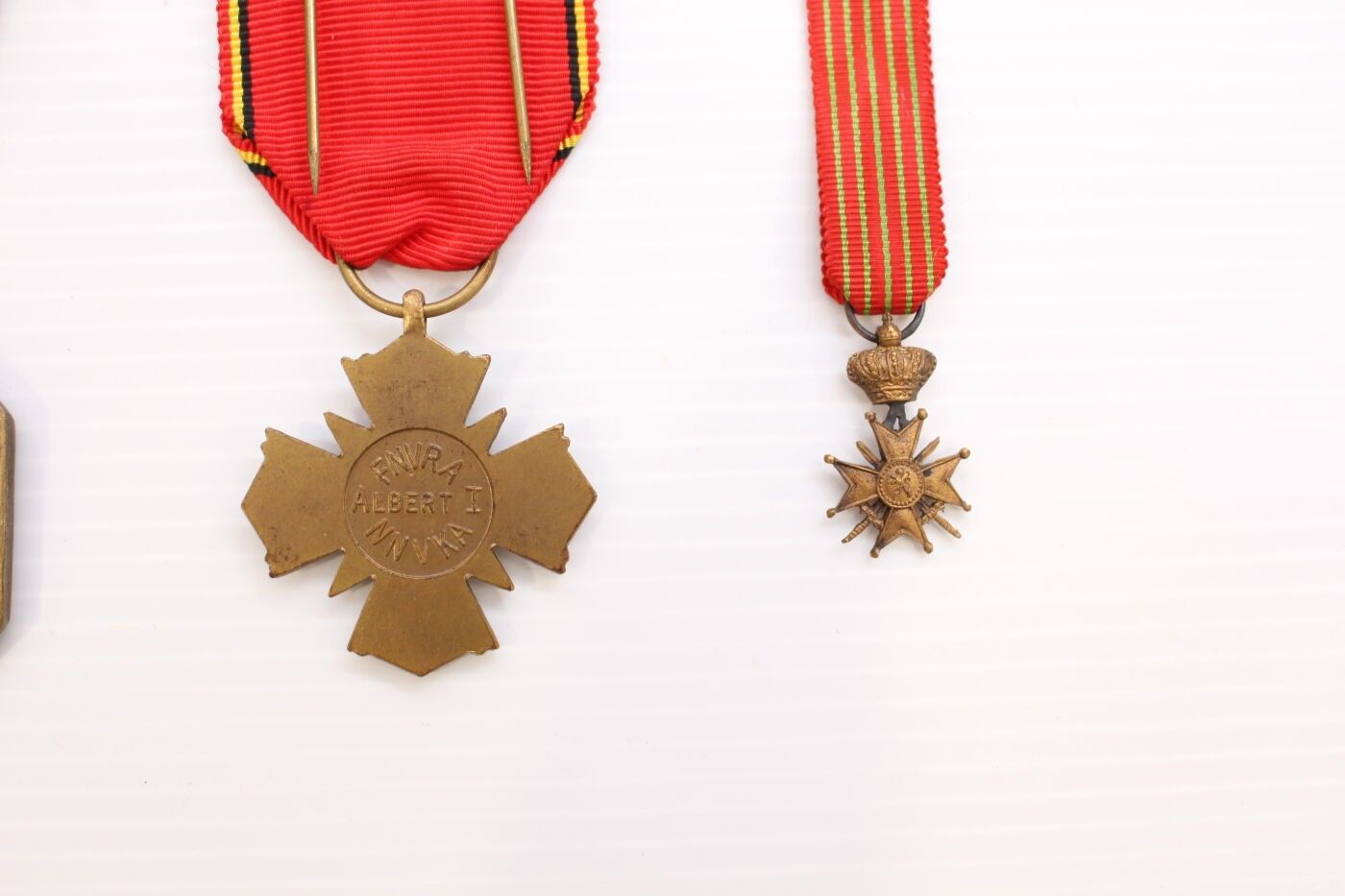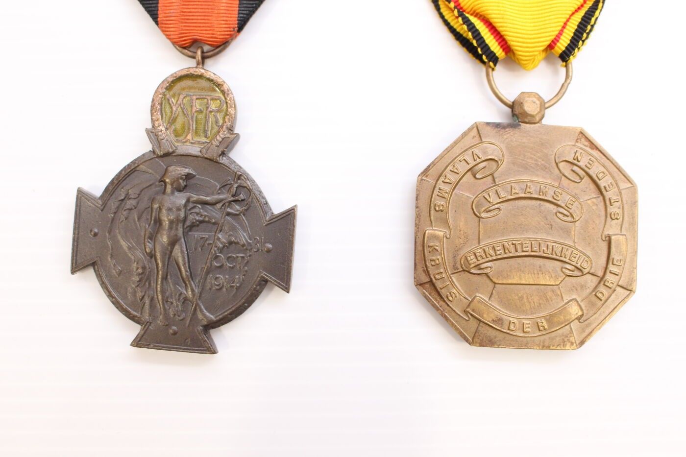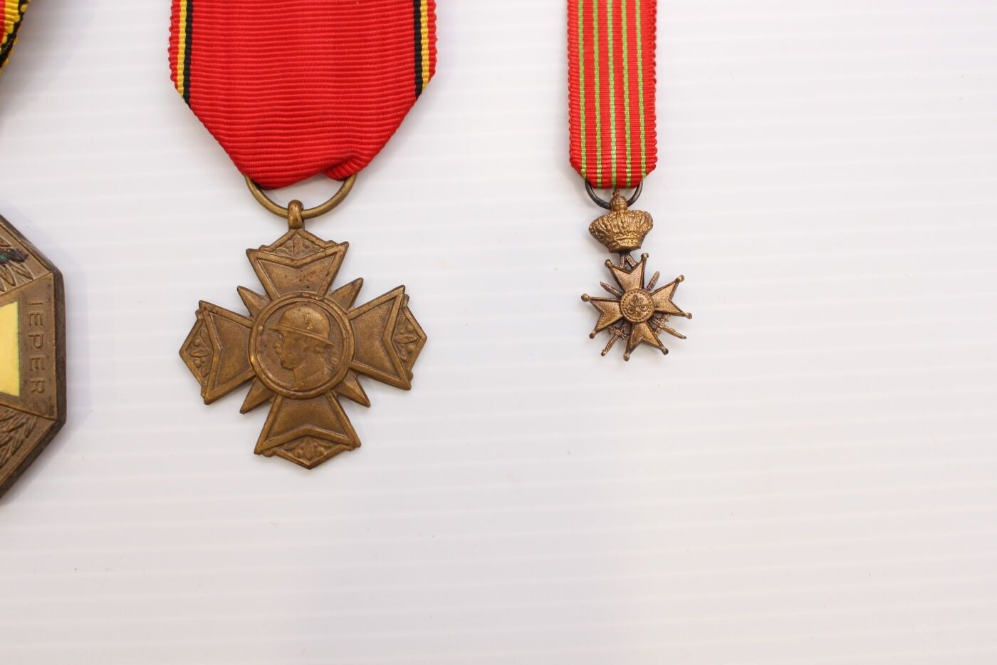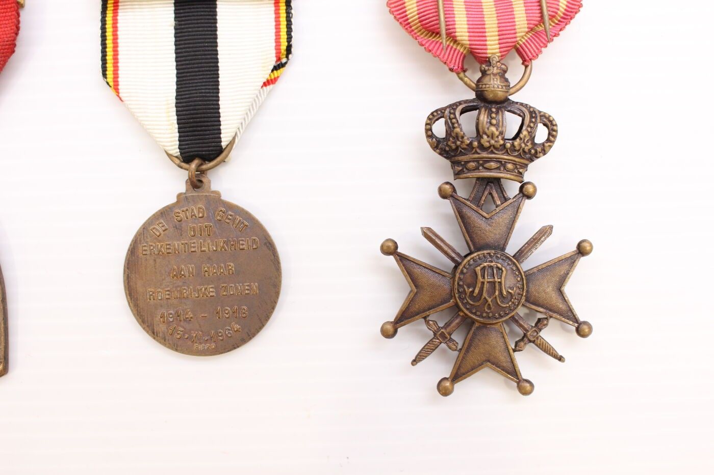 BELGIUM. Set of nine items including: Commémorative 1e GM en bronze et ruban avec sa miniature et sa Dixmude; Croix de guerre 1e GM en bronze et ruban avec sa miniature; médaille des anciens combattants en bronze et ruban; croix du lièvre en bronze et ruban; médaille de l'Yser en bronze et ruban; médaille des Trois cités en bronze, émail et ruban avec barrette Diksmuide; une commémorative de la 1e GM en bronze argenté et ruban. Early 20th century. Various sizes.