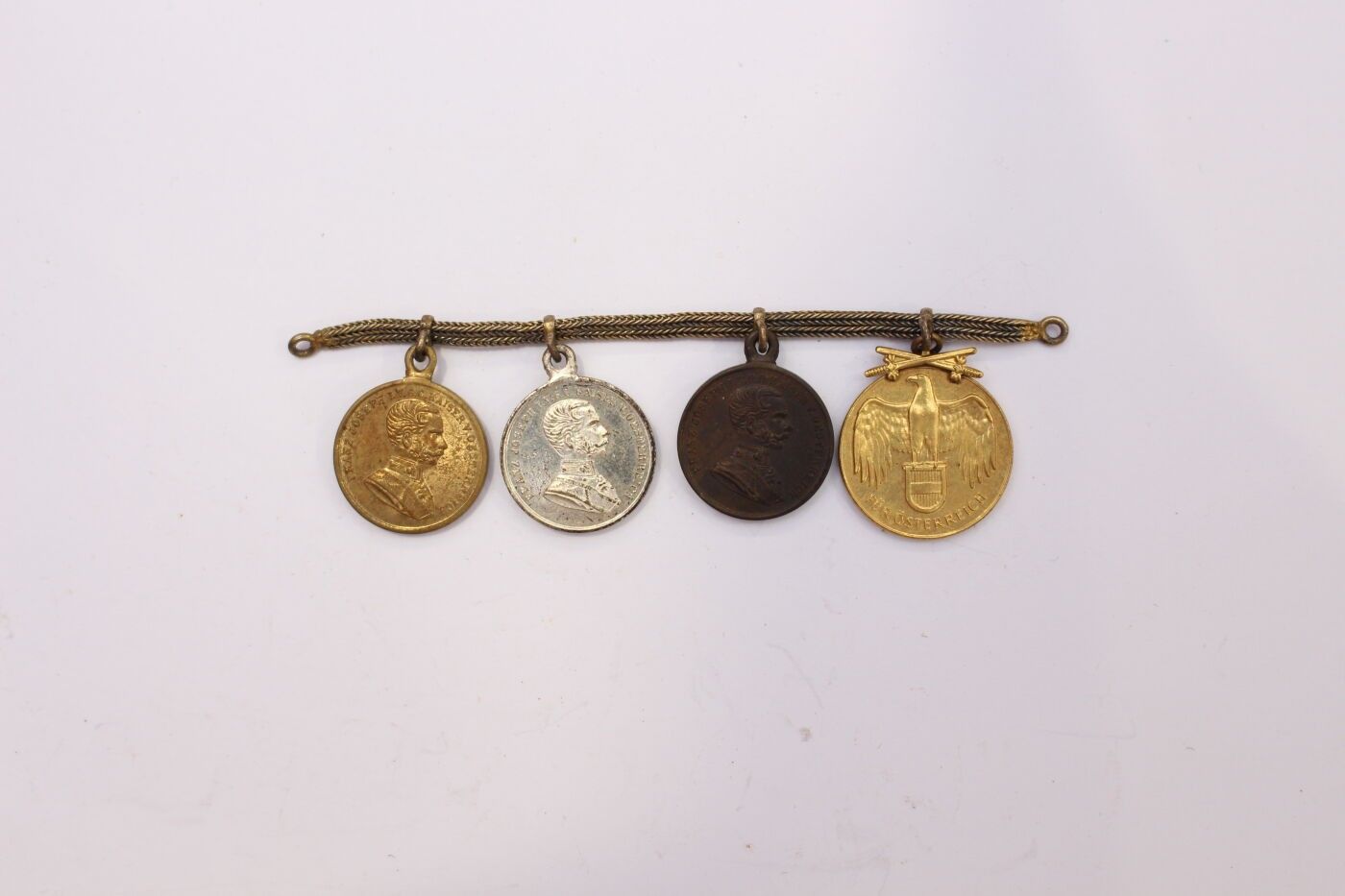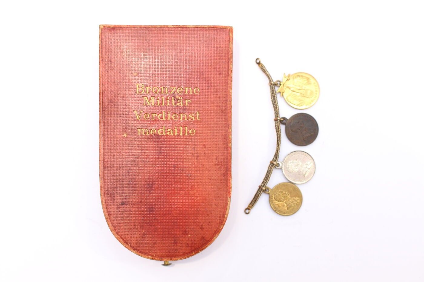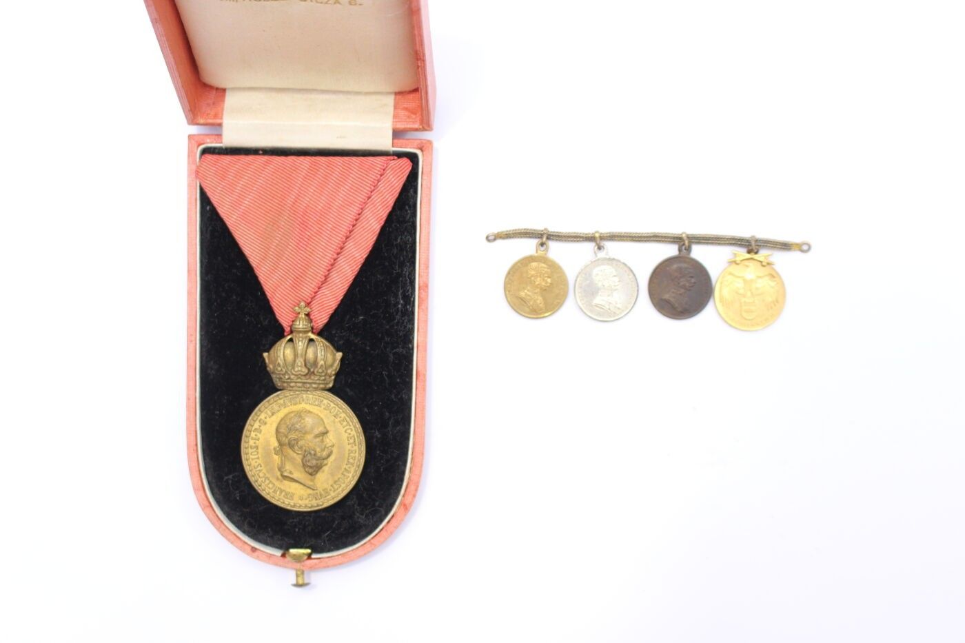 AUSTRIA-HUNGARY. Set of two items consisting of: bronze medal of military merit of the 1st type in gilt bronze and ribbon in its original case; four gala miniatures mounted on chains and consisting of three gold, silver and bronze medals for bravery in metal, gilt metal and silver metal and Austrian commemorative medal for 1914/1918 in gilt metal.