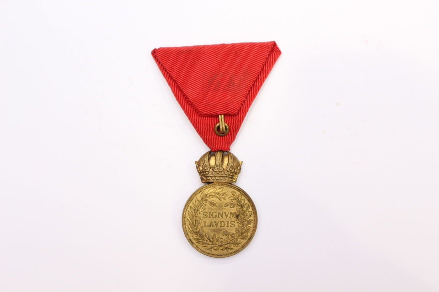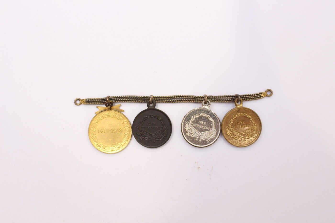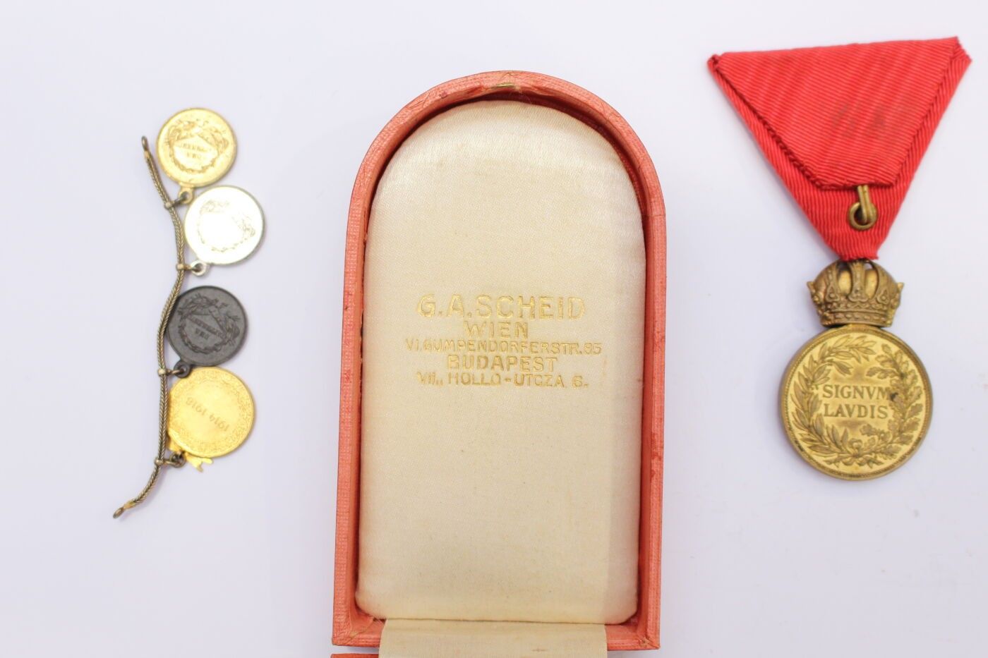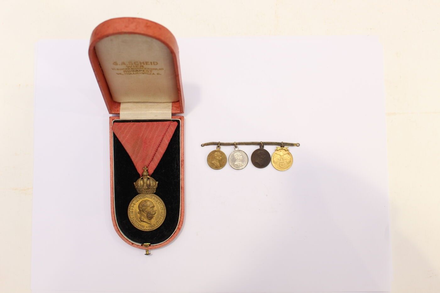 AUSTRIA-HUNGARY. Set of two items consisting of: bronze medal of military merit of the 1st type in gilt bronze and ribbon in its original case; four gala miniatures mounted on chains and consisting of three gold, silver and bronze medals for bravery in metal, gilt metal and silver metal and Austrian commemorative medal for 1914/1918 in gilt metal.