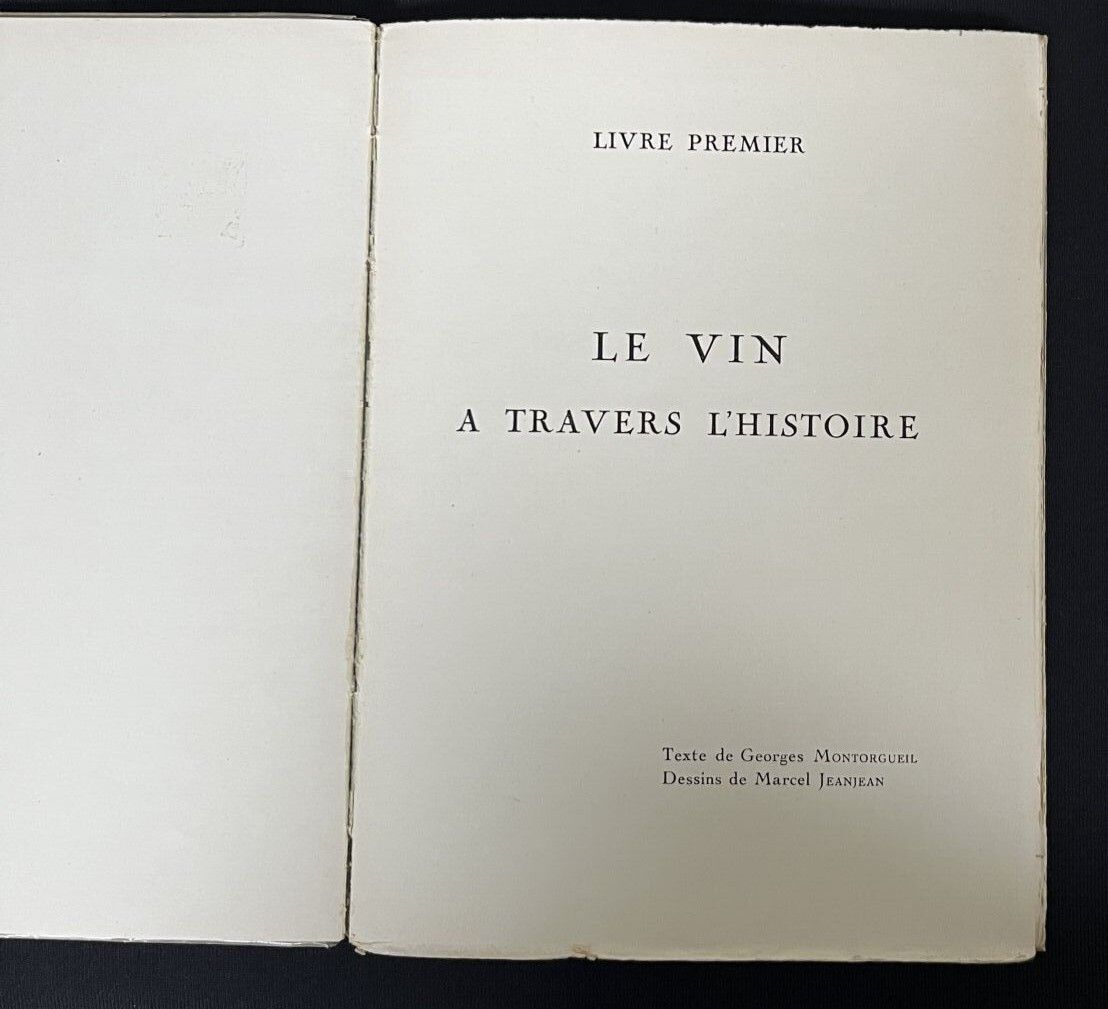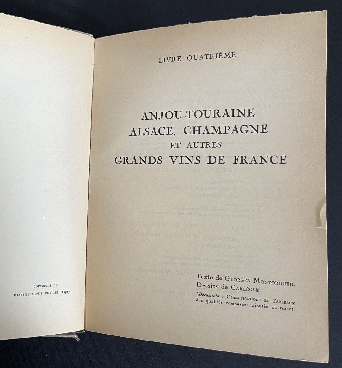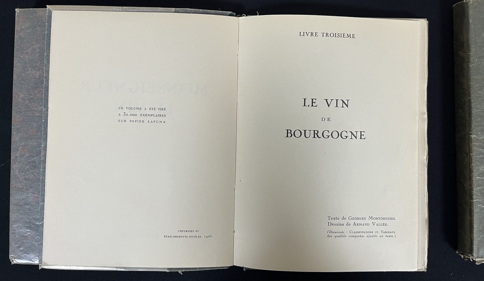 - Établissements Nicolas. Monseigneur le vin" series of five stapled volumes illustrated with watercolours. Book 1: Le vin à travers l'histoire, text by Georges Montorgueil and drawings by Marcel JEANJEAN; Book 2: Le vin de Bordeaux, text by G. Montorgueil and drawings by Pierre LISSAC; Book 3: Le vin de Bourgogne, text by G. Montorgueil and drawings by VALLEE; Book 4: Le vin de Bourgogne, text by G. Montorgueil and drawings by VALLEE. Montorgueil and drawings by VALLEE; Book 4e: Anjou-Touraine, Alsace, Champagne et autres grands vins de France, text by G. Montorgueil and drawings by CARLEGLE; L'art de boire, préparer, servir et boire, text by Louis Forest and drawings by Charles MARTIN.