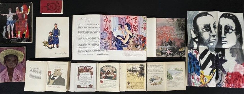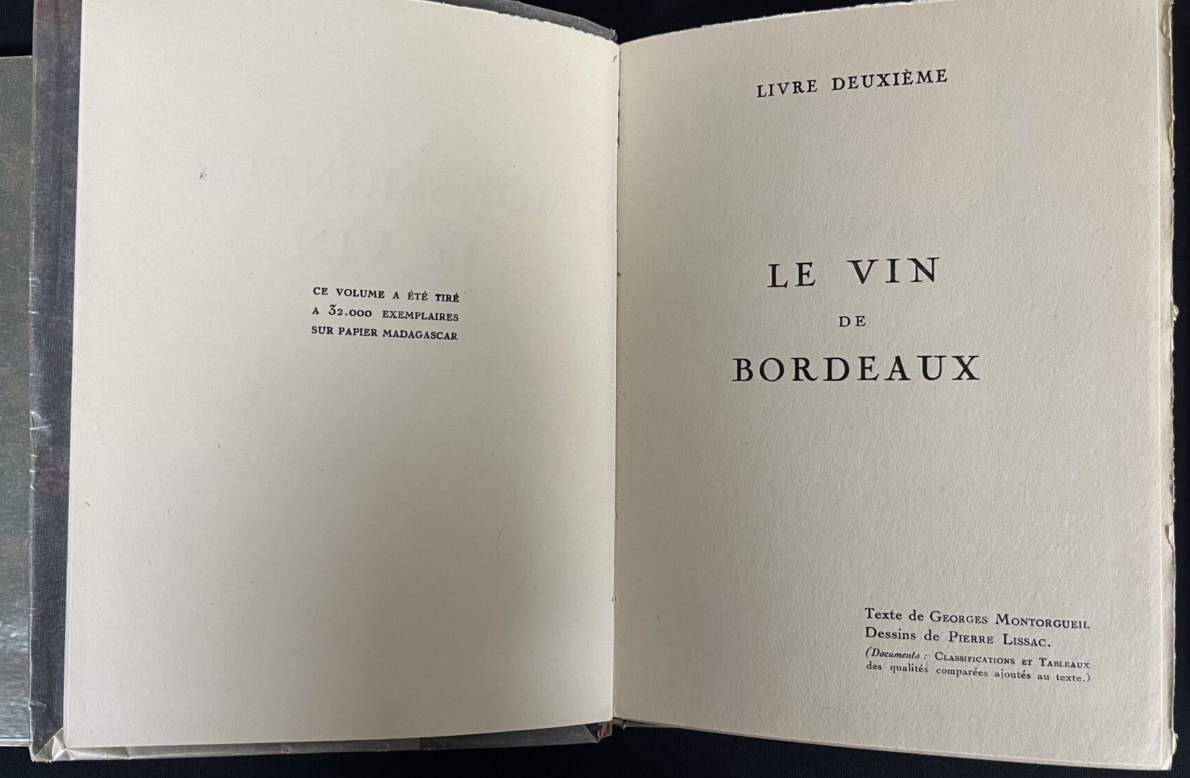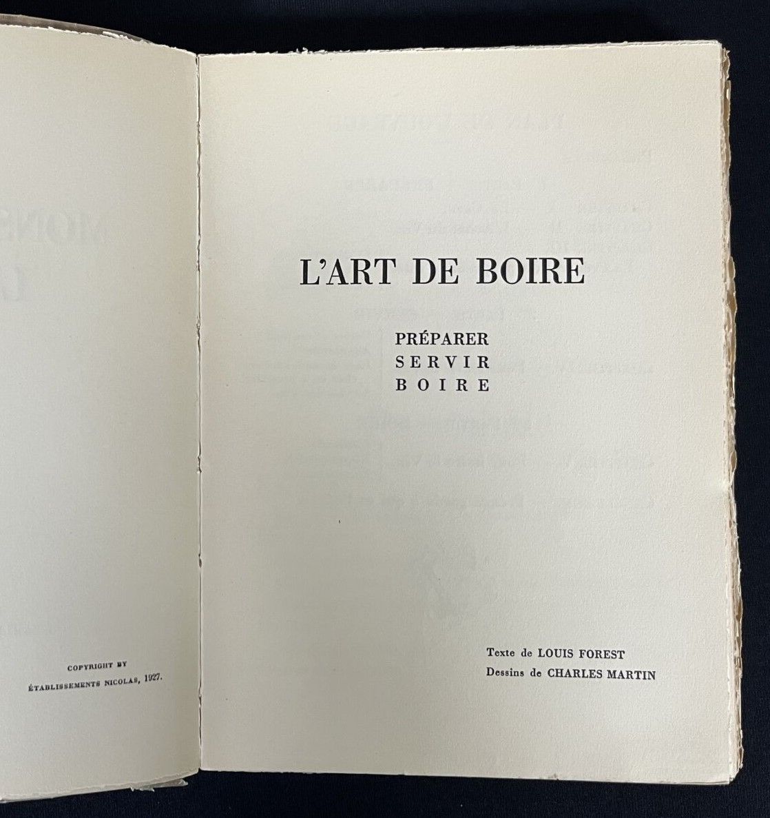 - Établissements Nicolas. Monseigneur le vin" series of five stapled volumes illustrated with watercolours. Book 1: Le vin à travers l'histoire, text by Georges Montorgueil and drawings by Marcel JEANJEAN; Book 2: Le vin de Bordeaux, text by G. Montorgueil and drawings by Pierre LISSAC; Book 3: Le vin de Bourgogne, text by G. Montorgueil and drawings by VALLEE; Book 4: Le vin de Bourgogne, text by G. Montorgueil and drawings by VALLEE. Montorgueil and drawings by VALLEE; Book 4e: Anjou-Touraine, Alsace, Champagne et autres grands vins de France, text by G. Montorgueil and drawings by CARLEGLE; L'art de boire, préparer, servir et boire, text by Louis Forest and drawings by Charles MARTIN.