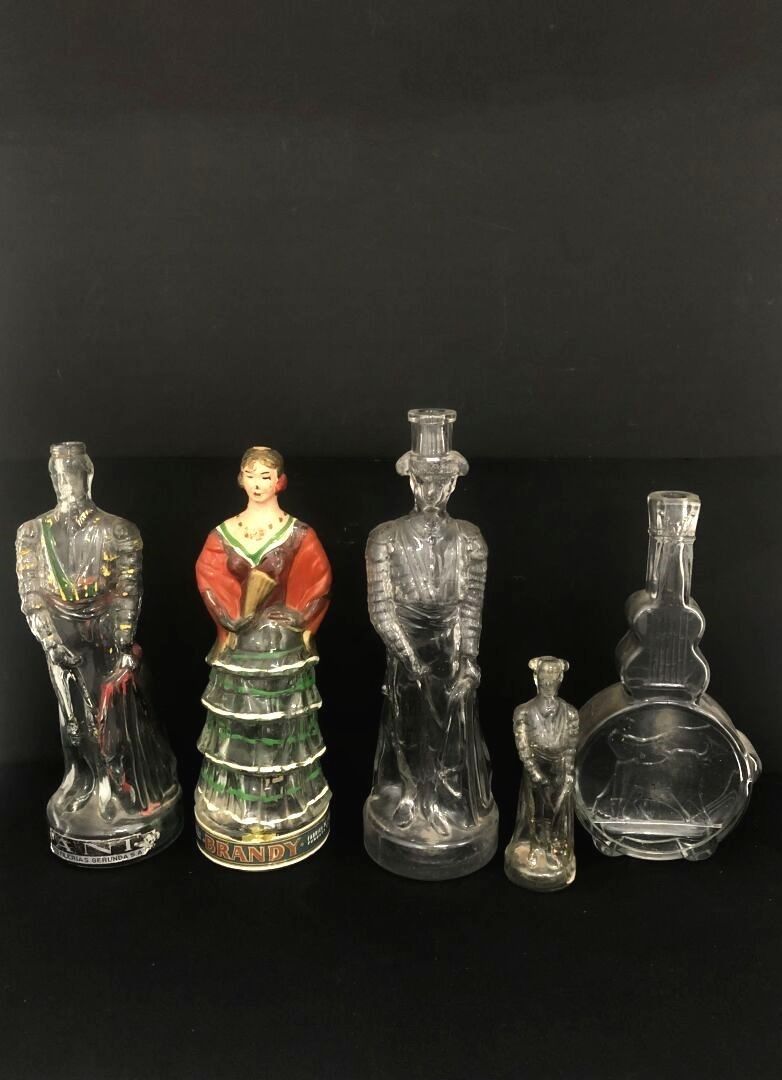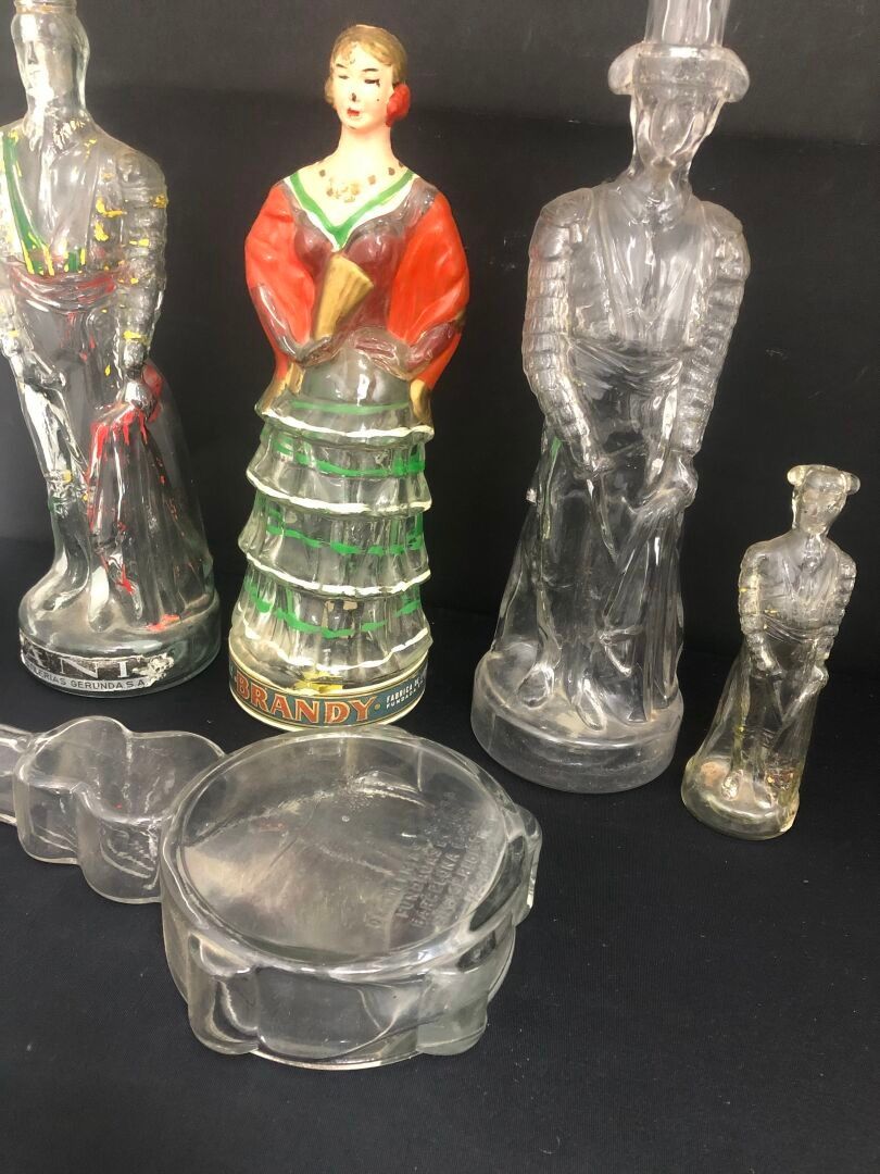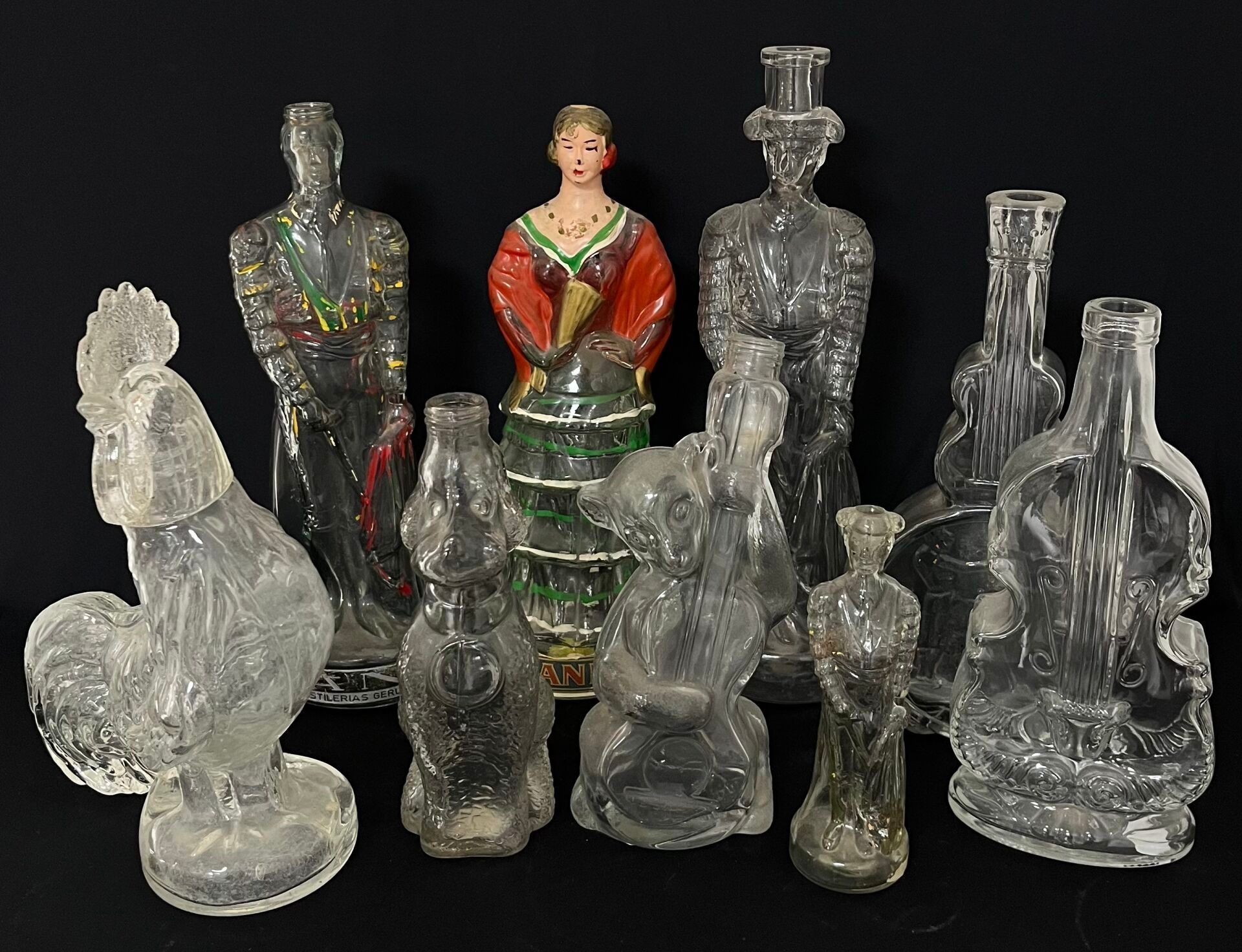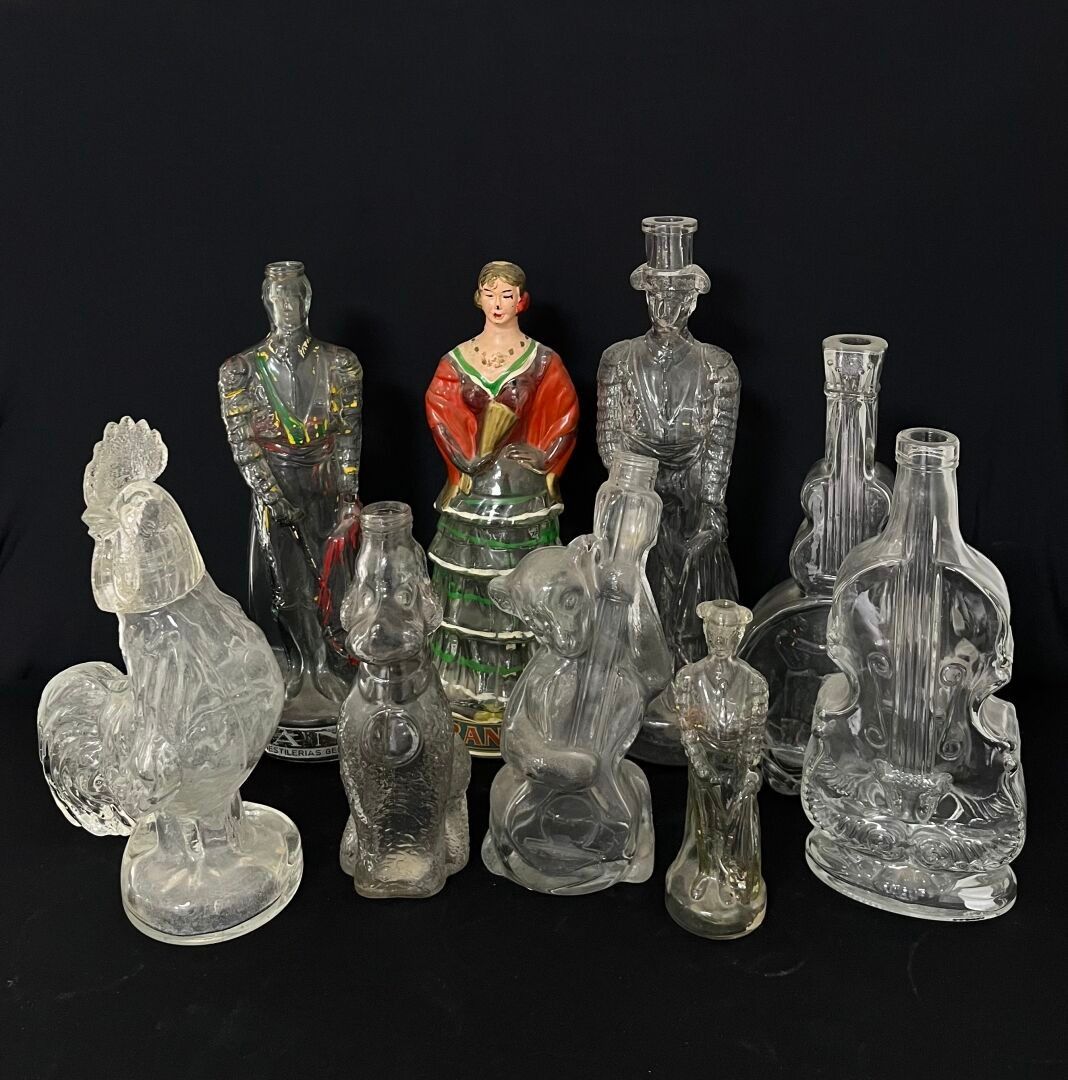 [Legras]. LOT of 9 moulded glass advertising decanters representing various subjects on the theme of Spain, music and animals.