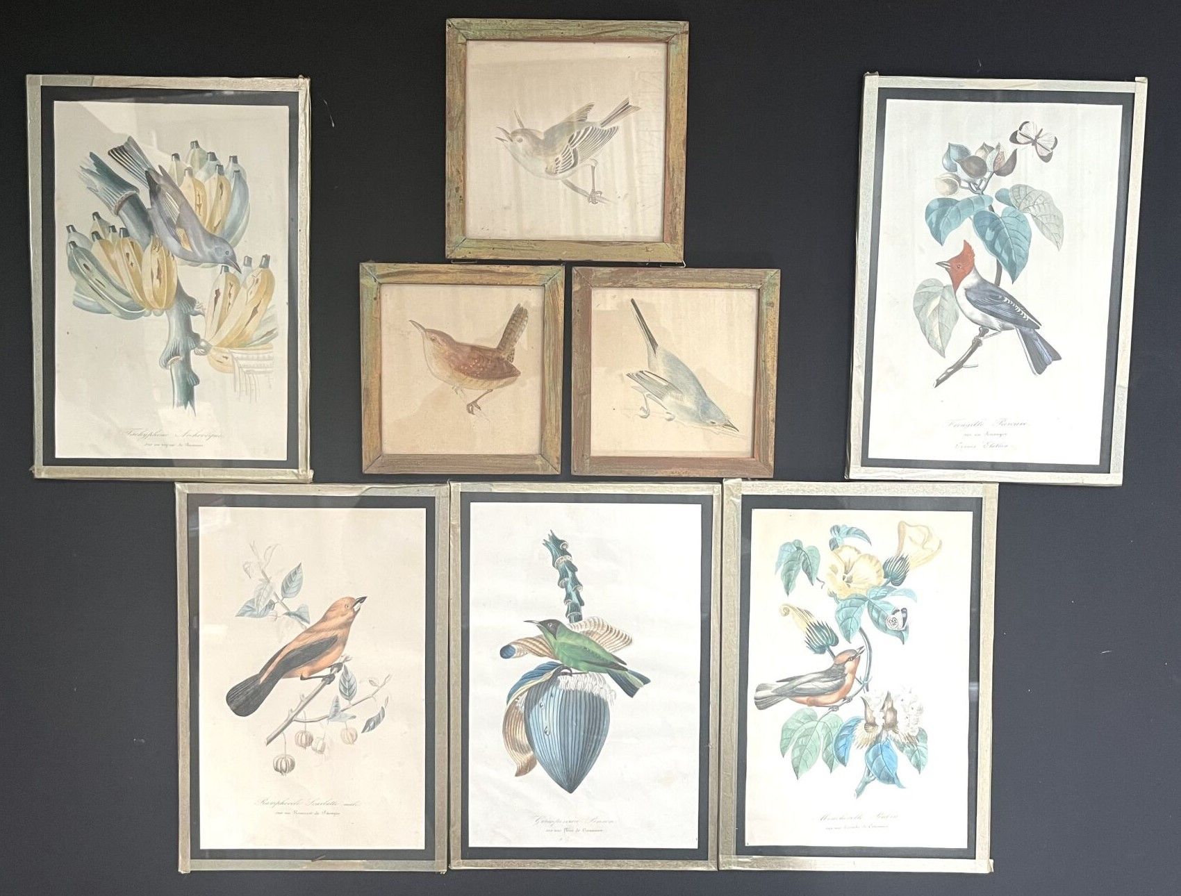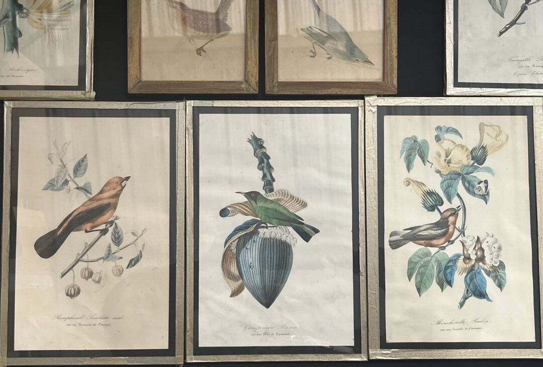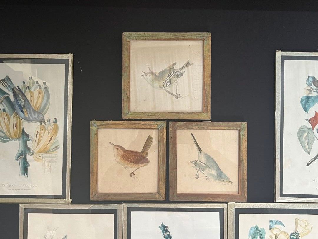 LOT of 3 watercolours and 5 coloured engravings on the theme of birds.