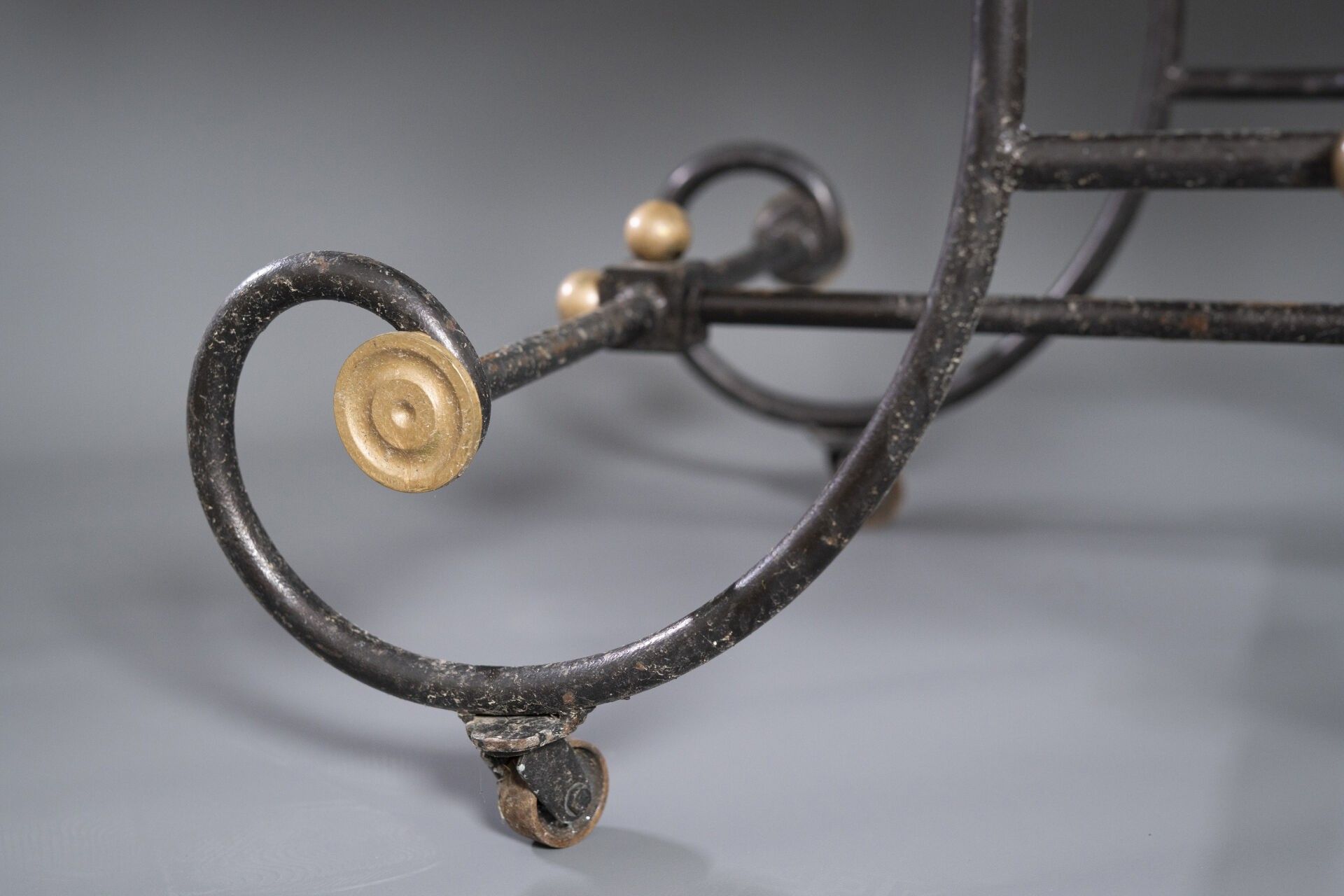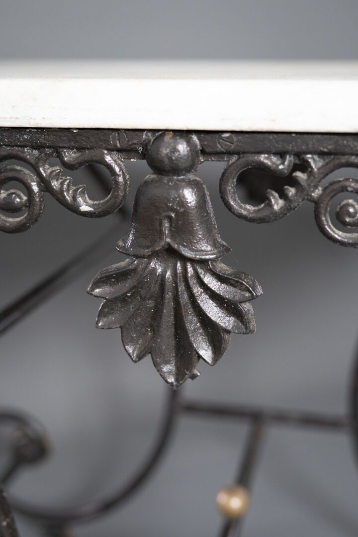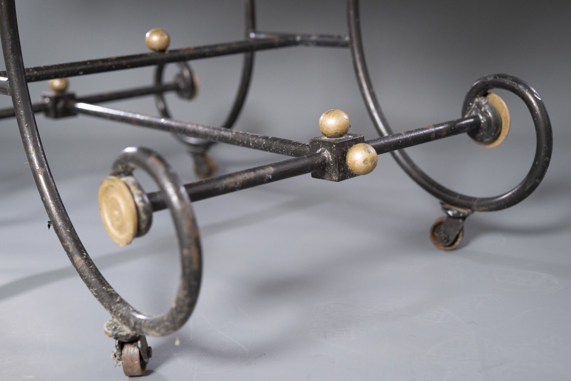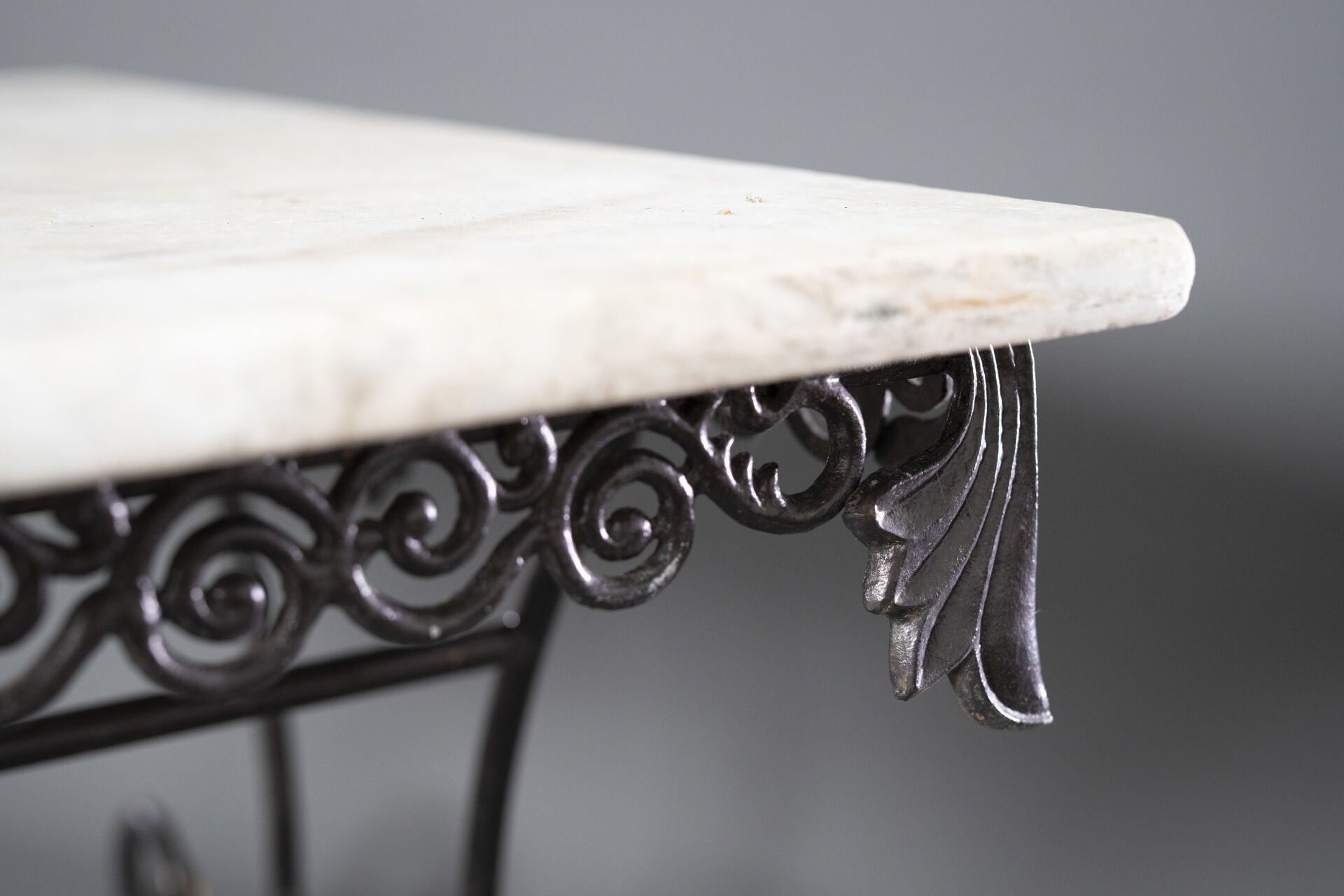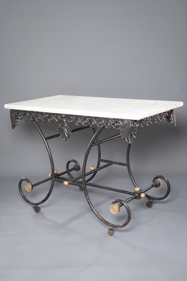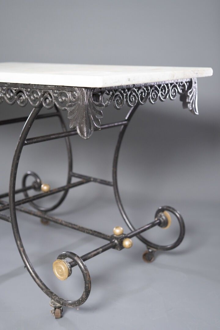 Butcher's table with cast iron and black lacquered wrought iron legs ending in castors, encircled by a serrated apron, white marble top.