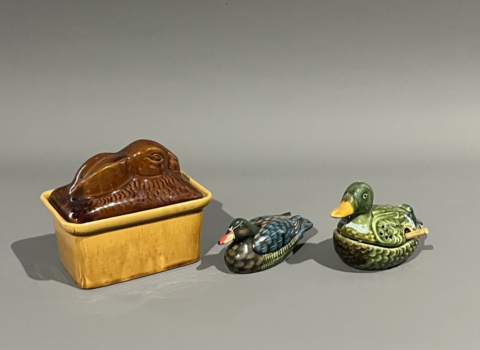 a mustard pot forming a duck, a small polychrome lacquered wooden box forming a duck and a terrine with a lid decorated with a hare.