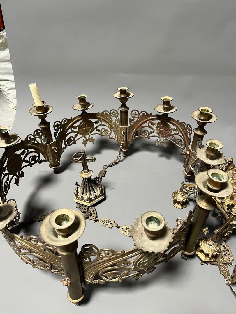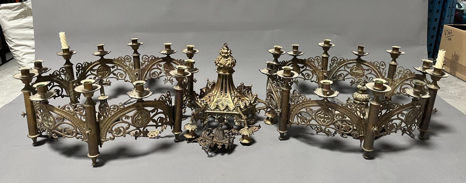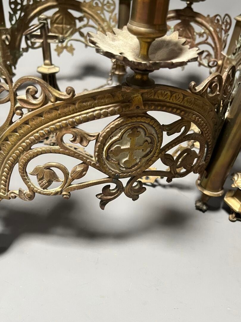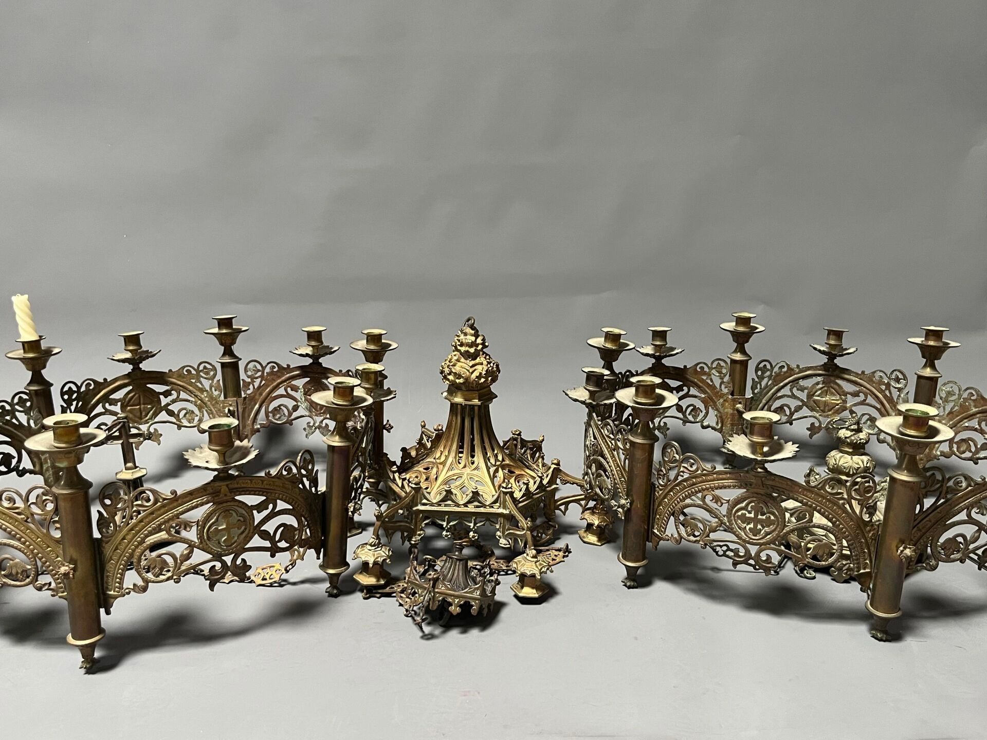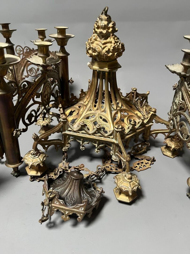 A SET of three Neo-Gothic style ormolu and brass chandeliers, the two larger ones with quatrefoil and interlace decoration and the smaller one with arcature decoration.