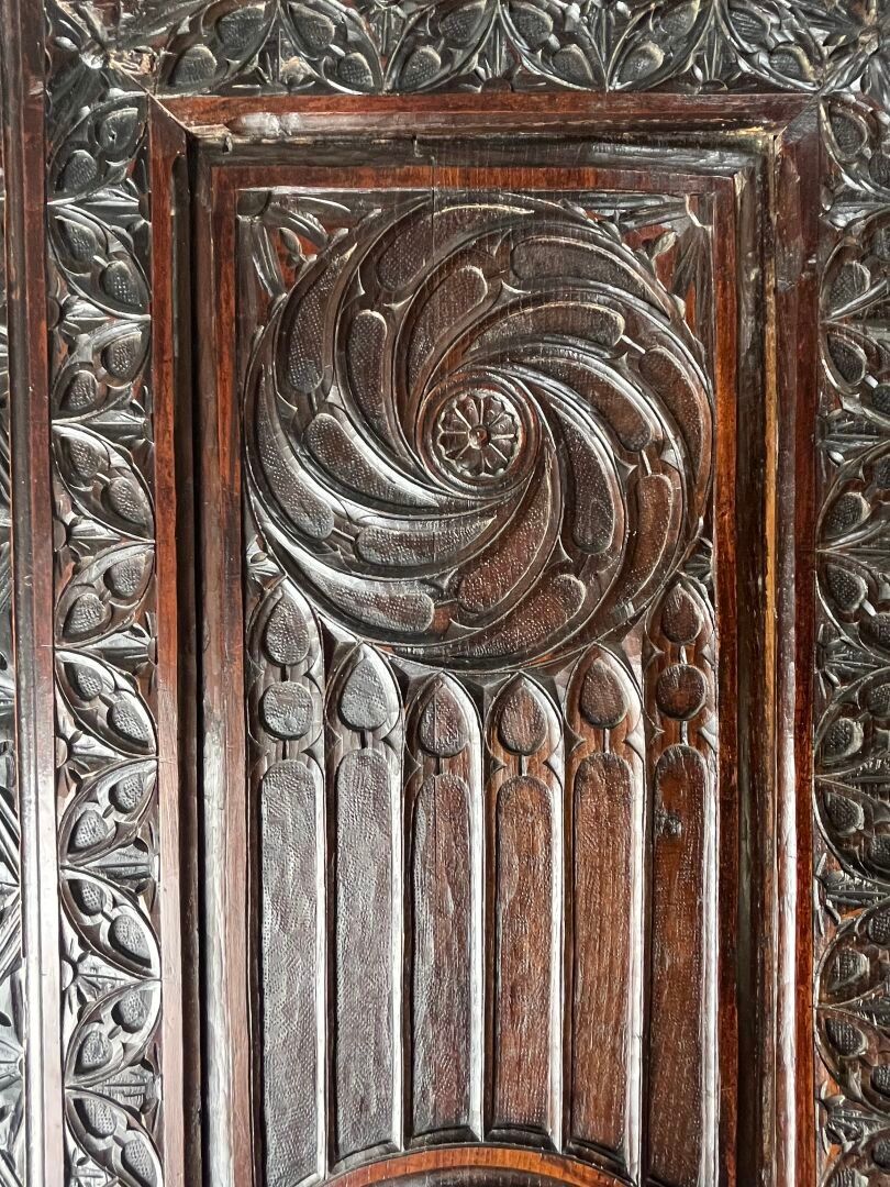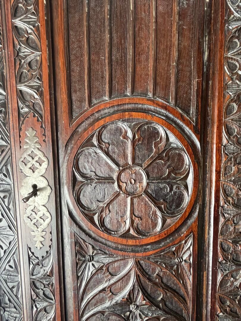 Neo-Gothic oak ARMOIRE with carved arcades and rosettes, ope…