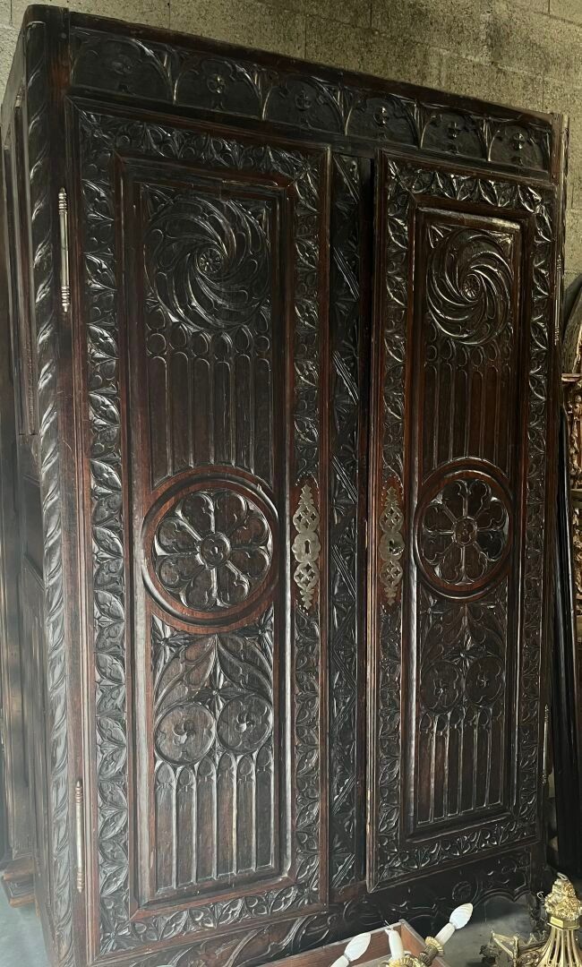 Neo-Gothic oak ARMOIRE with carved arcades and rosettes, opening with two doors.