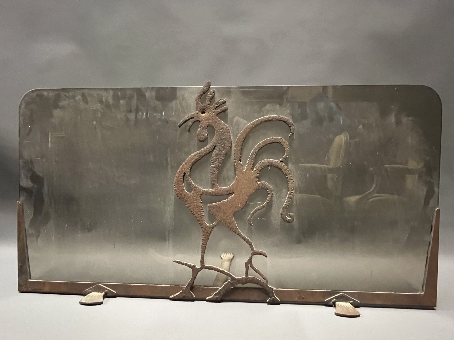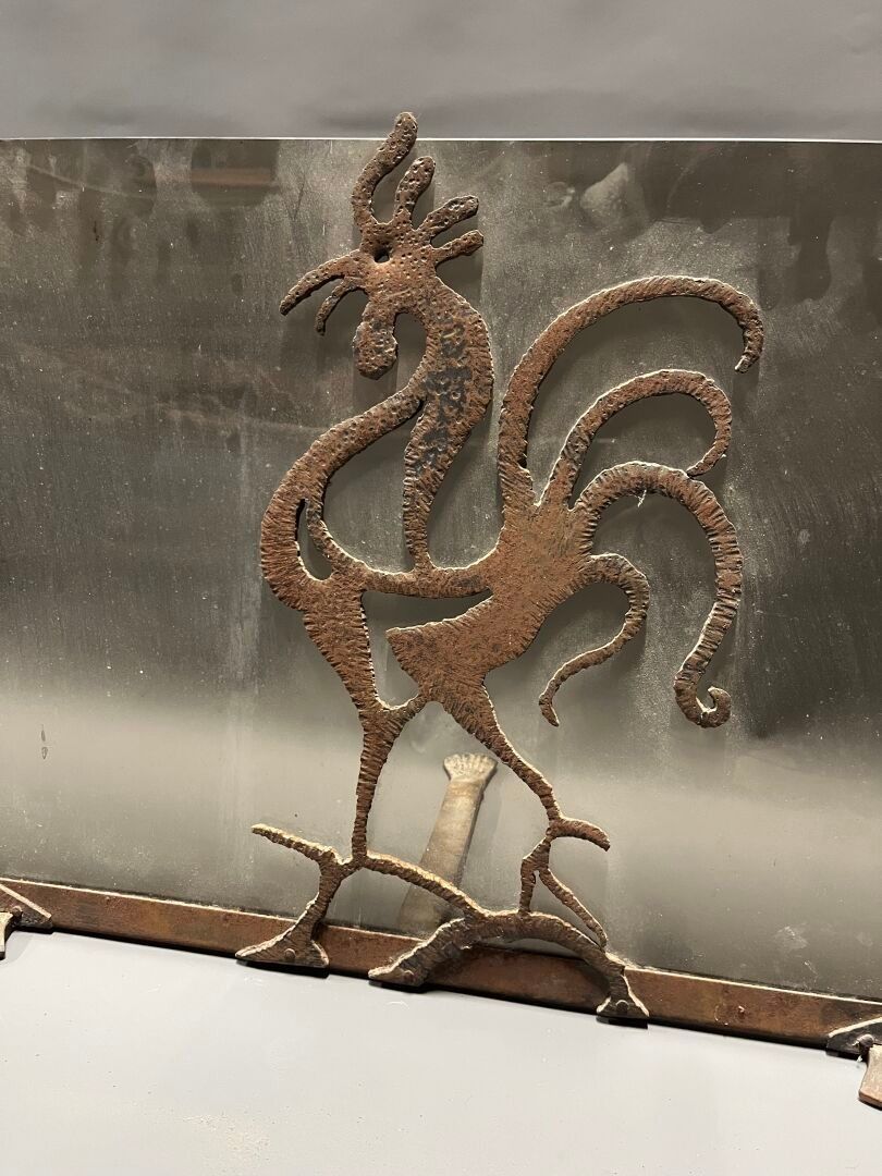 Fireplace screen in smoked glass and metal decorated with a rooster.