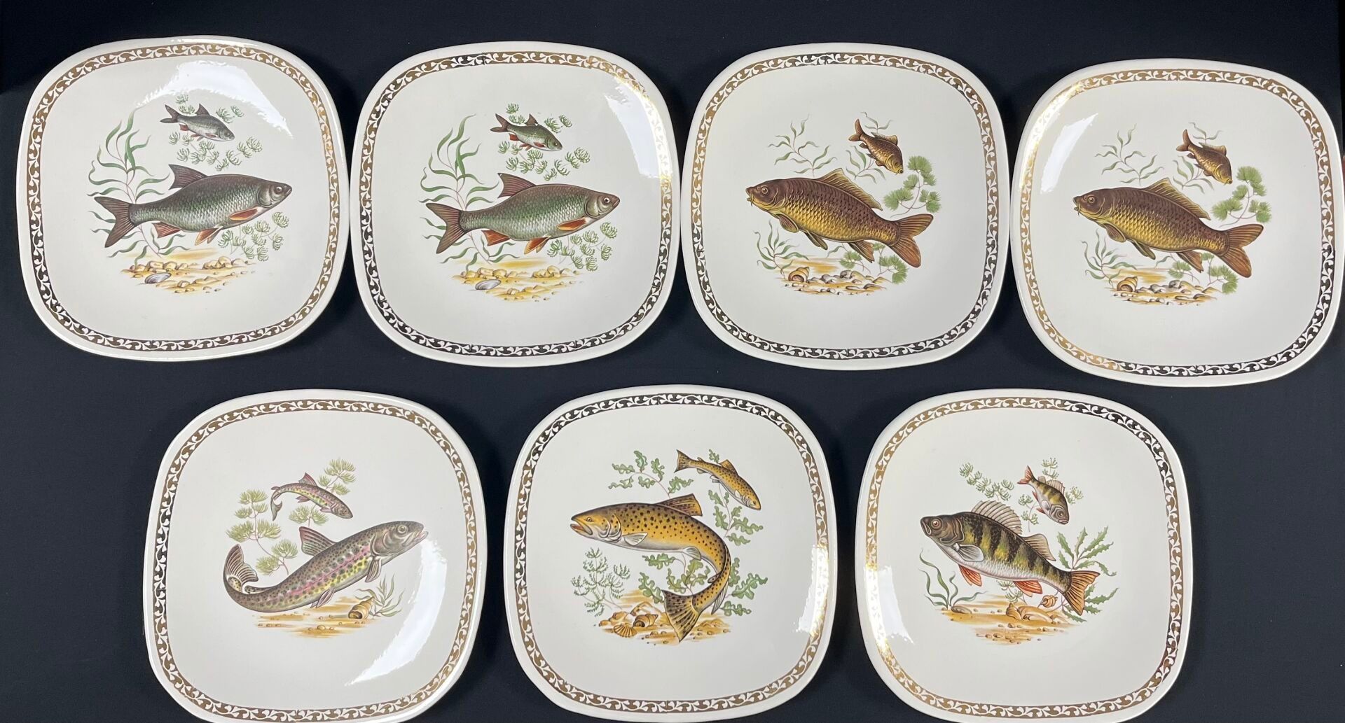 SEVEN square fish plates and one fish dish in fine earthenware.