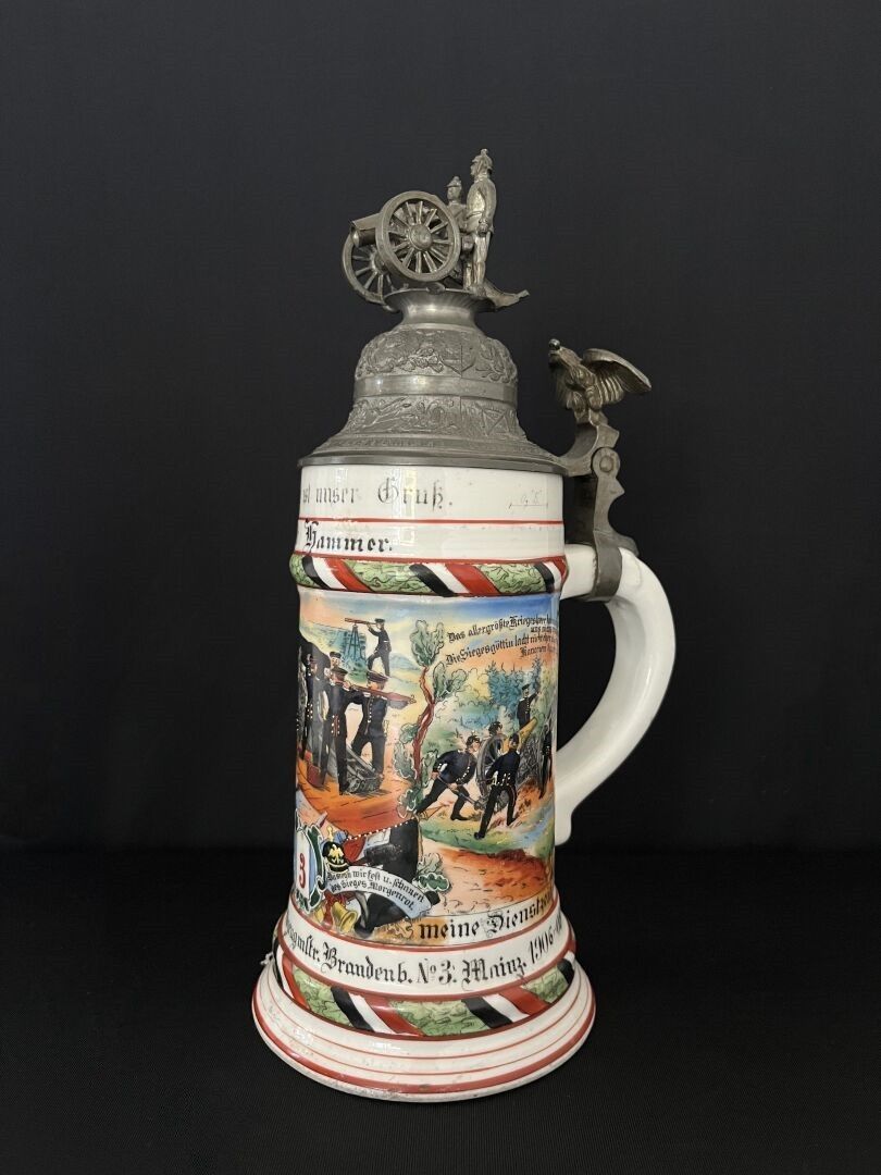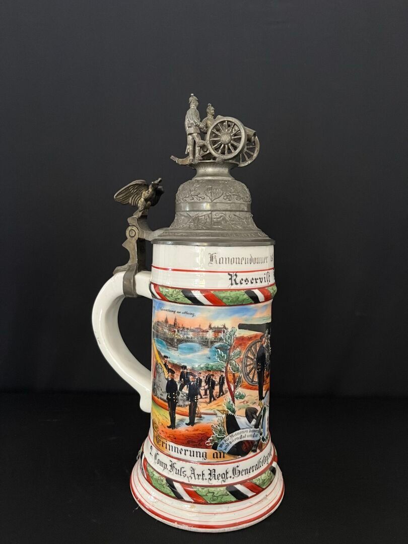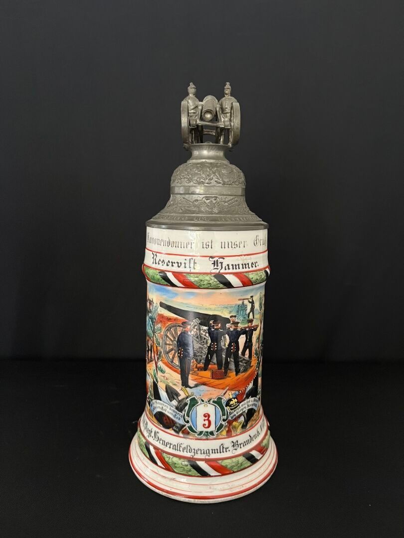 [Militaria]. Polychrome porcelain conscript's CHOPE with artillery decoration, pewter lid representing two artillerymen of the Prussian army.