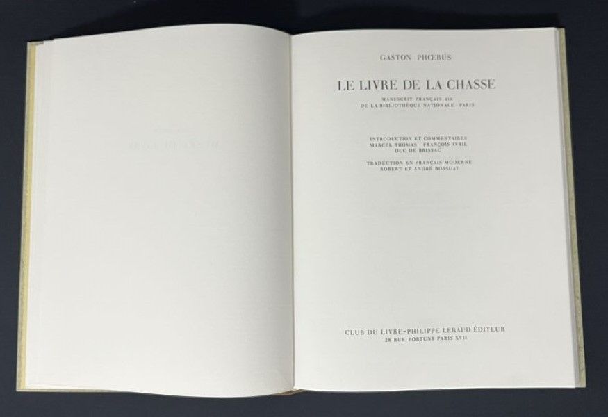 [Hunting]. GASTON III (Count of Foix), known as PHOEBUS. The hunting book. French Manuscript 616 from the Bibliothèque nationale, Paris. Introduction and commentary [by] M. Thomas, F. Avril, and the Duc de Brissac. Paris, Club du Livre - P. Lebaud, 1976. 2 volumes in-4, facsimile in full leather binding and commentary in publisher's half-binding, slipcases.