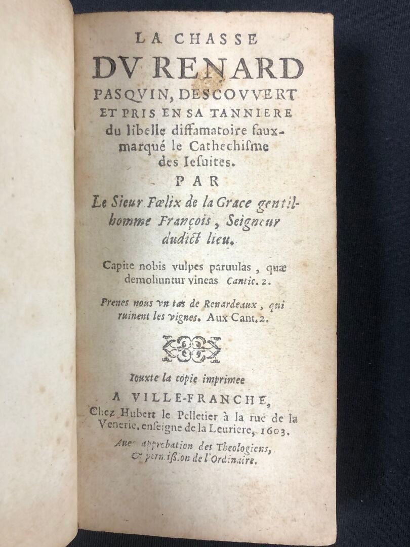 [RICHEOME (Louis). La chasse du renard Pasquin, descouvert et pris en sa tannière du libelle diffamatoire faux-marqué le Cathéchisme des Jesuites. Par le sieur Foelix de La Grace, gentil-homme François... S.l., Jouxte la copie imprimée à Ville-Franche, chez Hubert Le Pelletier, 1603. In-12, [2] f., 359 p., half-fawn basane circa 1900, smooth spine, gilt title (spine rubbed bottom board detached, small ink stains in margins, russeting to title, worm tracery in margins of last quire).