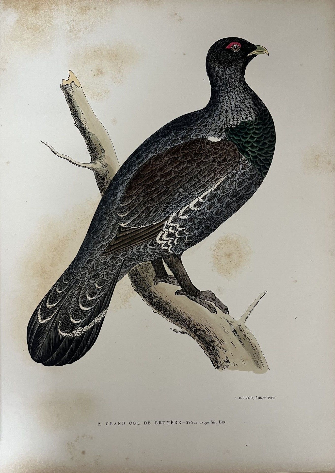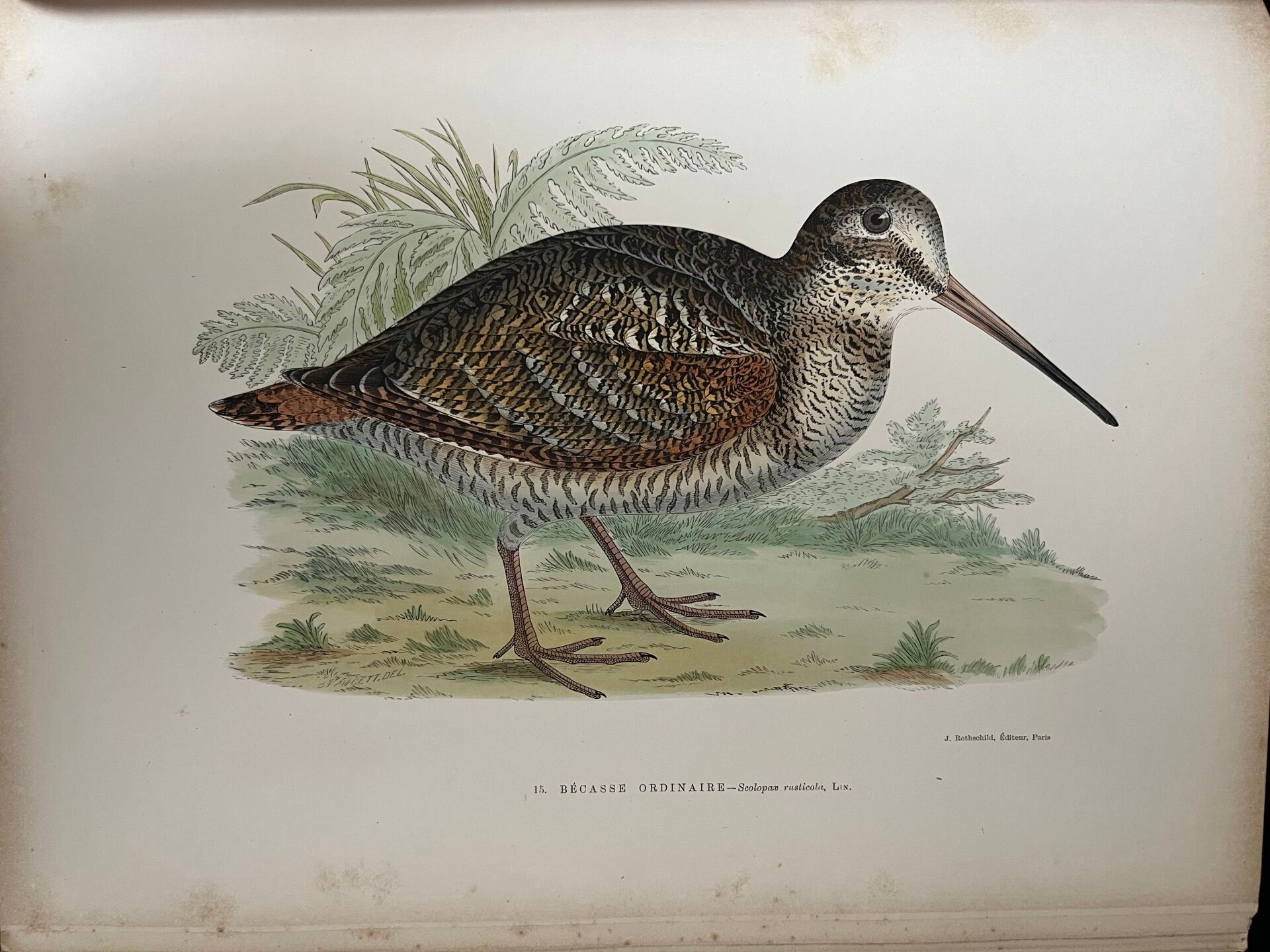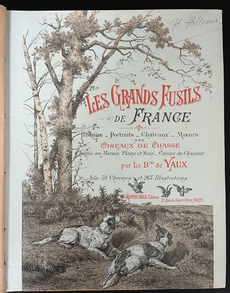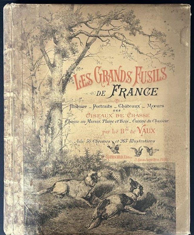 [Hunting]. VAUX (Charles Maurice de). The great guns of France. History, portraits, castles. Hunting in marshes, plains and woods. The hunter's cuisine. Breeding, manners, customs of game birds. Paris, J. Rothschild, 1898. Large in-4, publisher's binding, brown half-basin with corners, spine with 4 bands, white mosaic boxes bearing the title and address, upper cover reproducing the original cover illustrated in colour, gilt head, original dust jacket (yellowing browned and repaired, upper spine cracked, corners a little rubbed; scattered freckling, heavier on a few plates but generally sparing the figures).