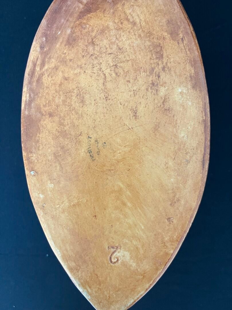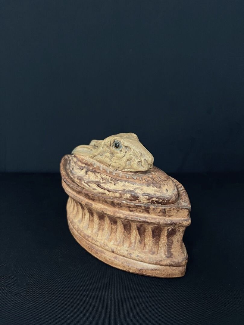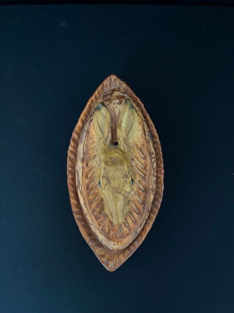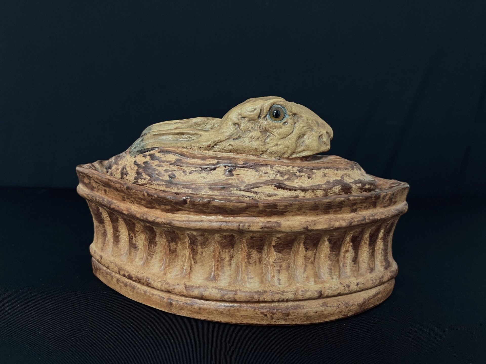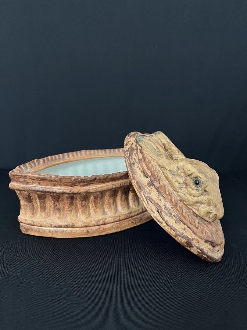 A varnished porcelain navette-shaped tureen, with a hare's head on the lid and glass eyes.