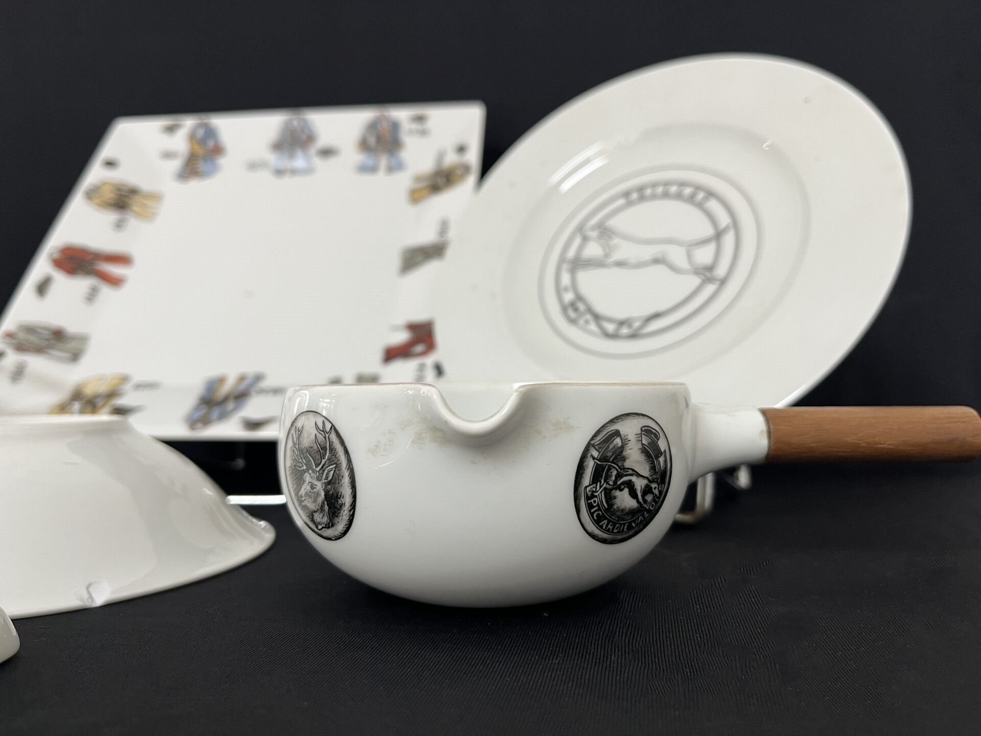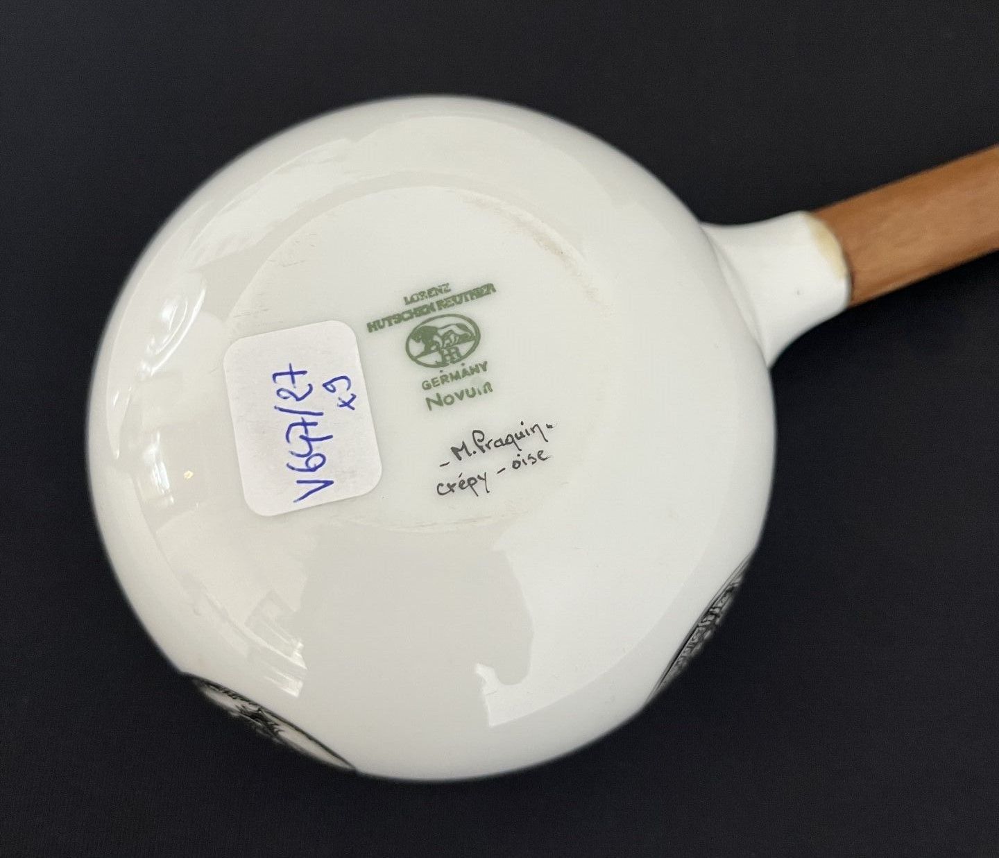 - HUTSCHENREUTHER: a porcelain saucepan decorated with the Rallye pique avant Nivernais (detached wooden handle), a porcelain coffee cup decorated with the Rallye Trois Forêts and a porcelain pocket protector decorated with the Château de Chantilly, hand-painted by Michel PRAQUIN in Crépy-en-Valois (Oise).