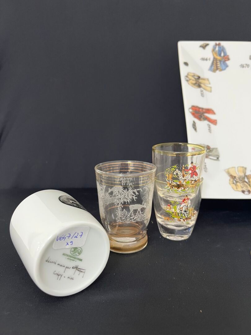 - Two liqueur glasses with polychrome decoration of a hunting scene, inscribed "the kill" and "the chase". Height 5.5cm.
