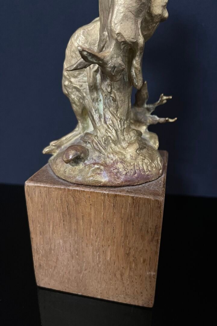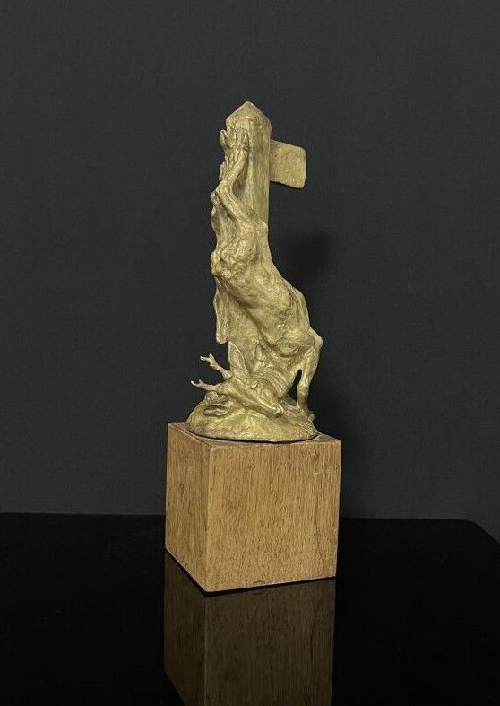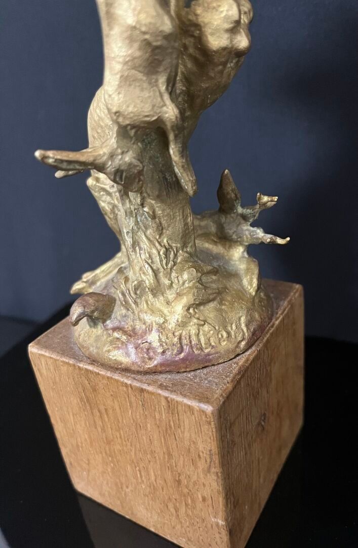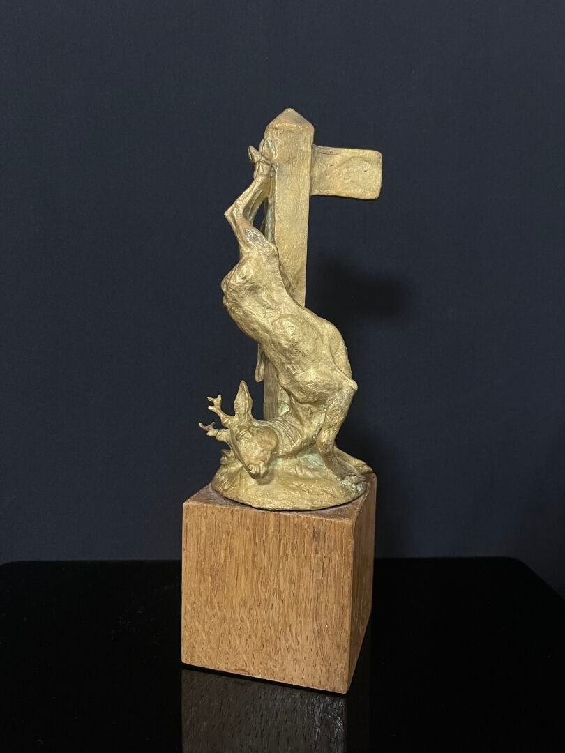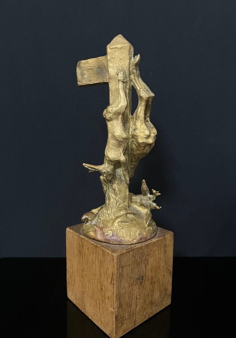 Gilt bronze proof representing a deer and a hare hanging from a post.