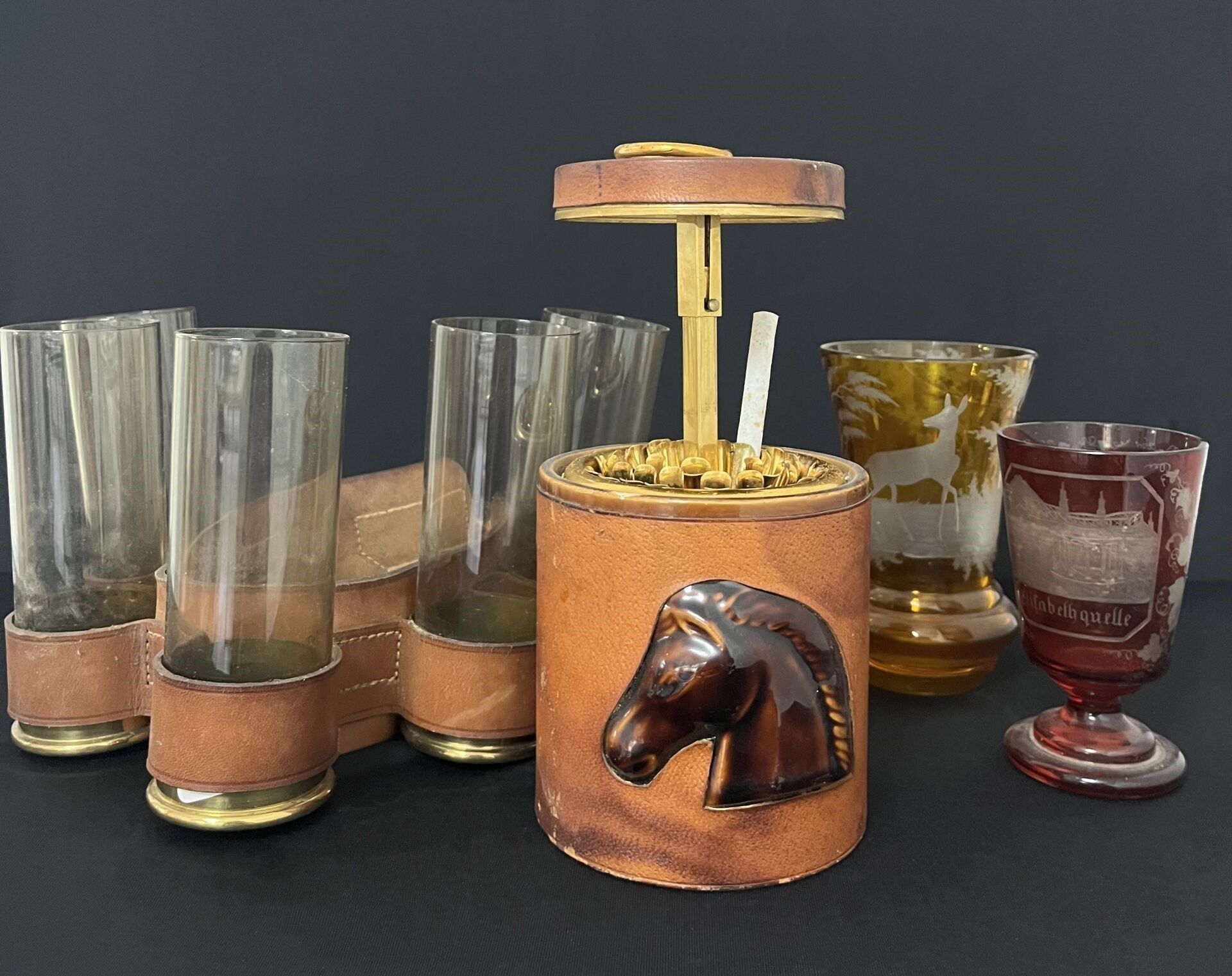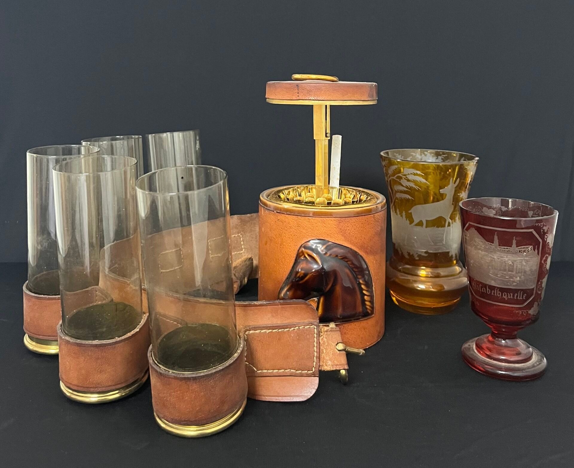 [Cynégétique]. LOT comprising a leather belt holding five smoked glasses and metal imitating a socket; a leather-covered ceramic tobacco pot/cigarette holder, a yellow-tinted crystal vase with engraved decoration of a doe in an undergrowth and a red-tinted crystal stemmed glass with ground decoration of a park in a reserve flanked by vine bulbs.