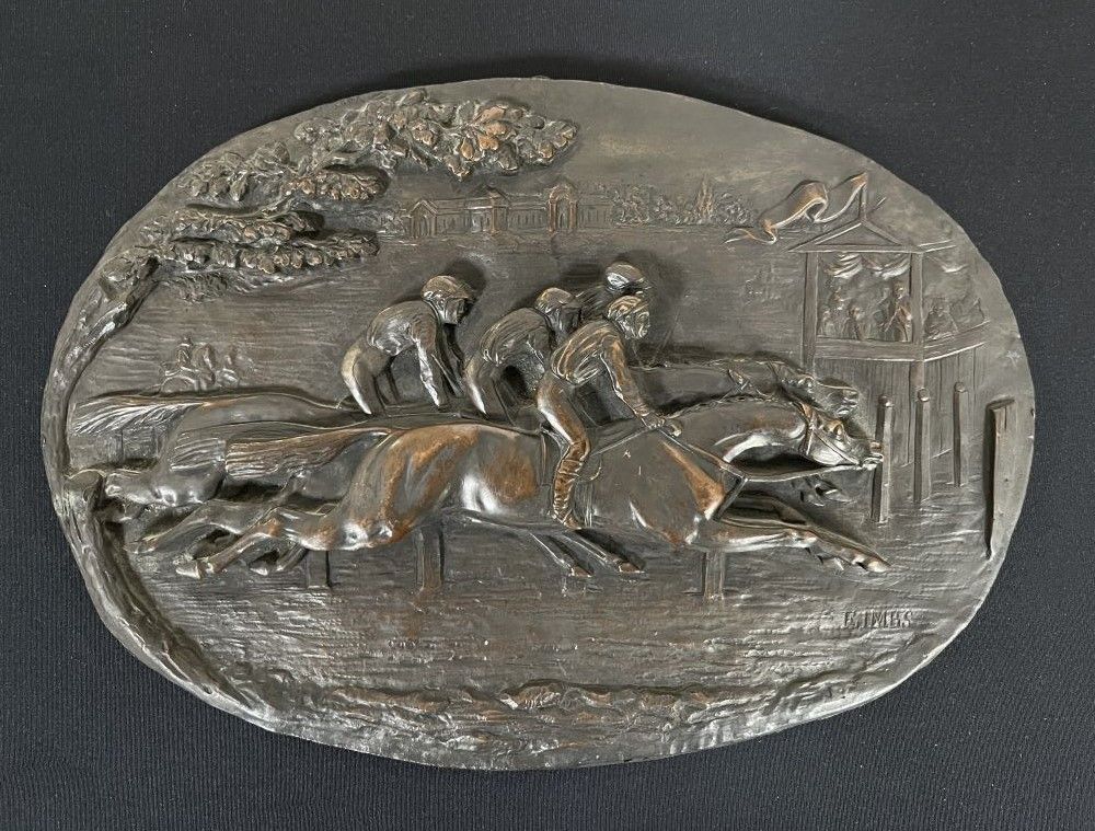 F. IMBS Horse race. Oval metal plate with patina signed.