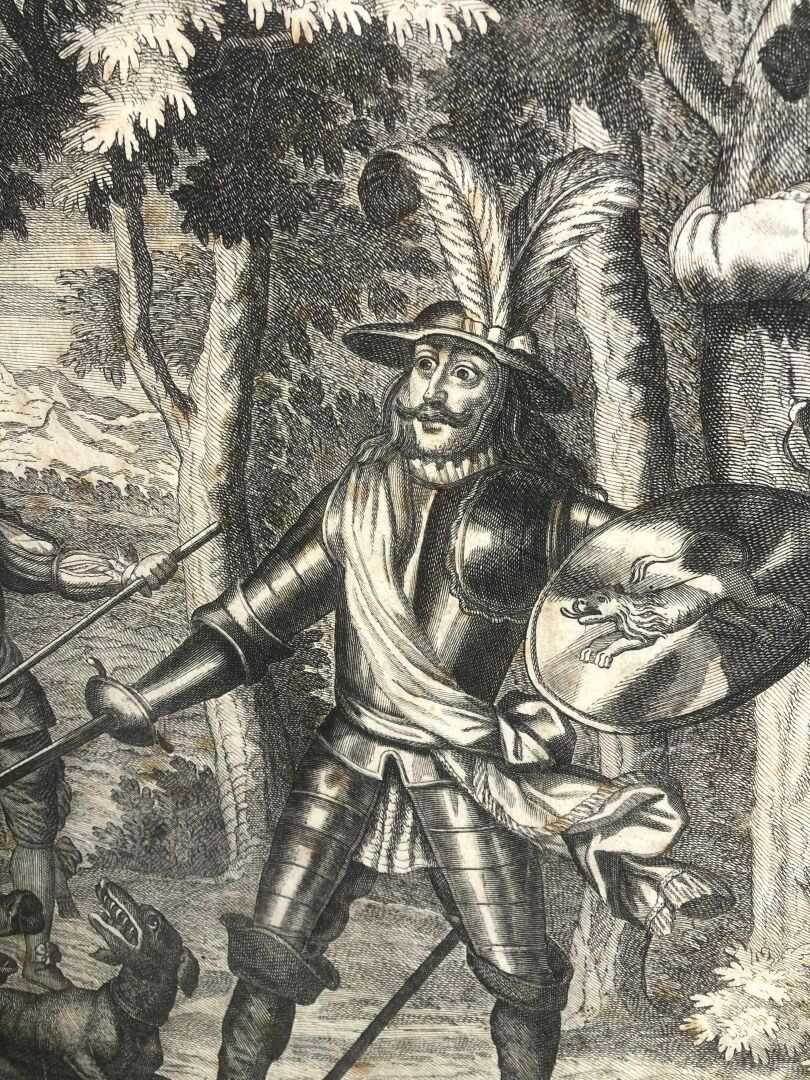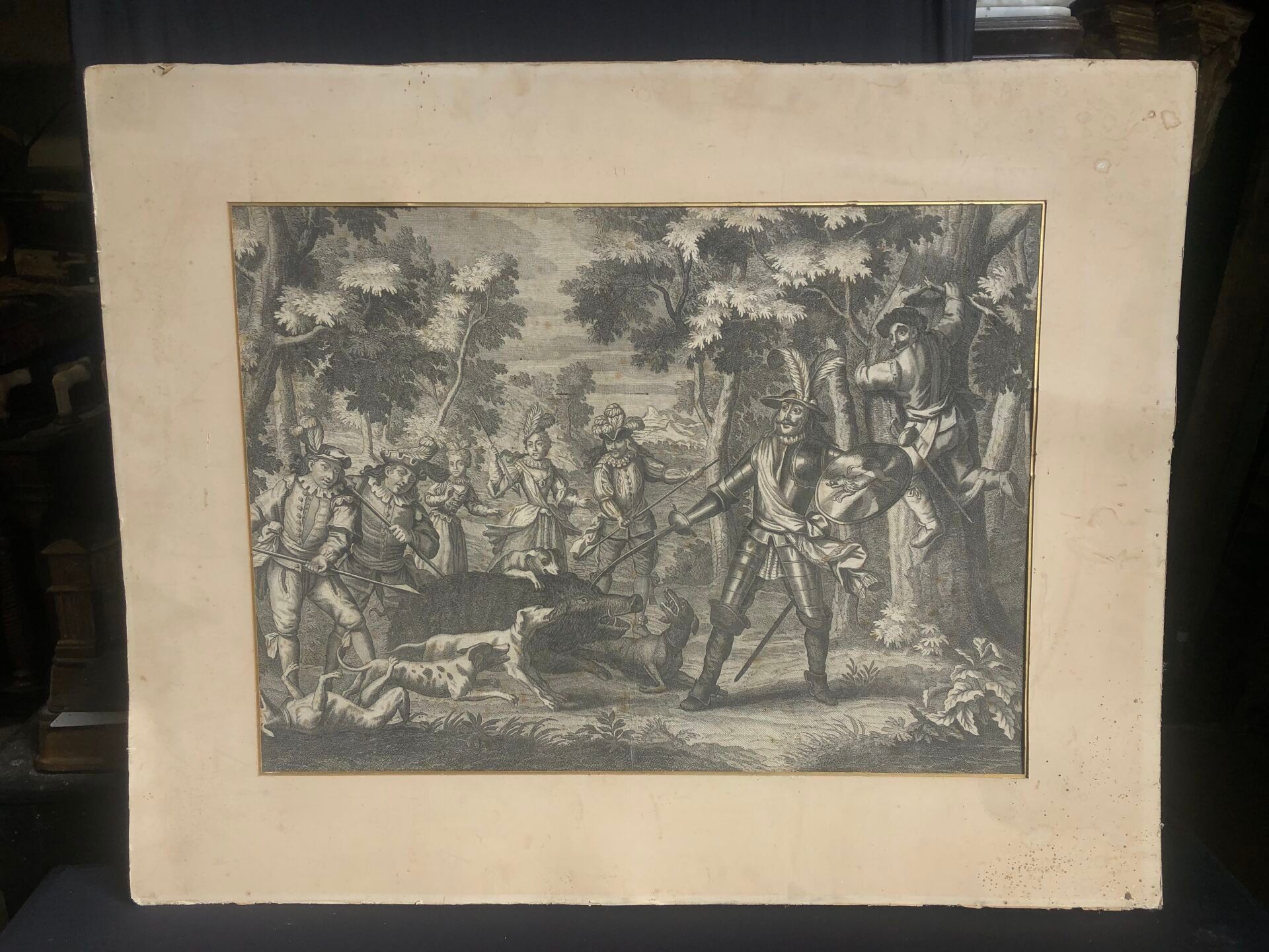 Engraving representing a hunting scene pasted on a cardboard panel.