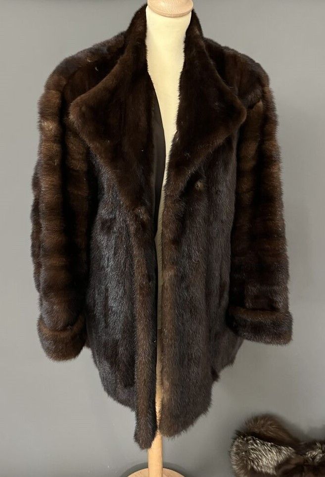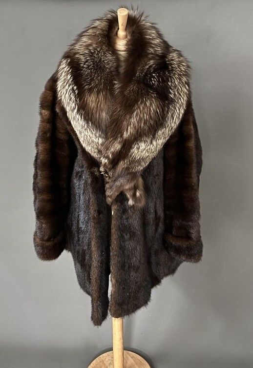 Mink fur mid-length coat with stand-up collar and clip faste…