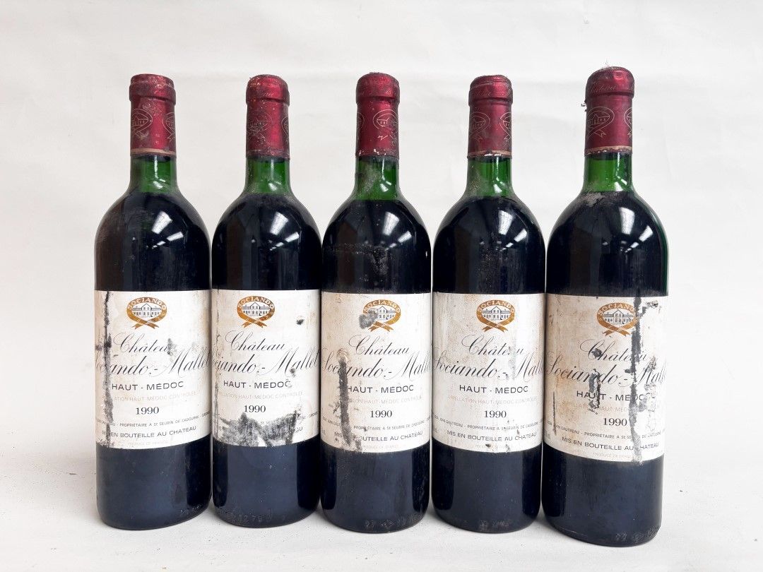 5 Bottles Château SOCIANDO-MALLET - Haut-Médoc 1990 Slightly damaged labels. 3 slightly low and 2 high shoulder.