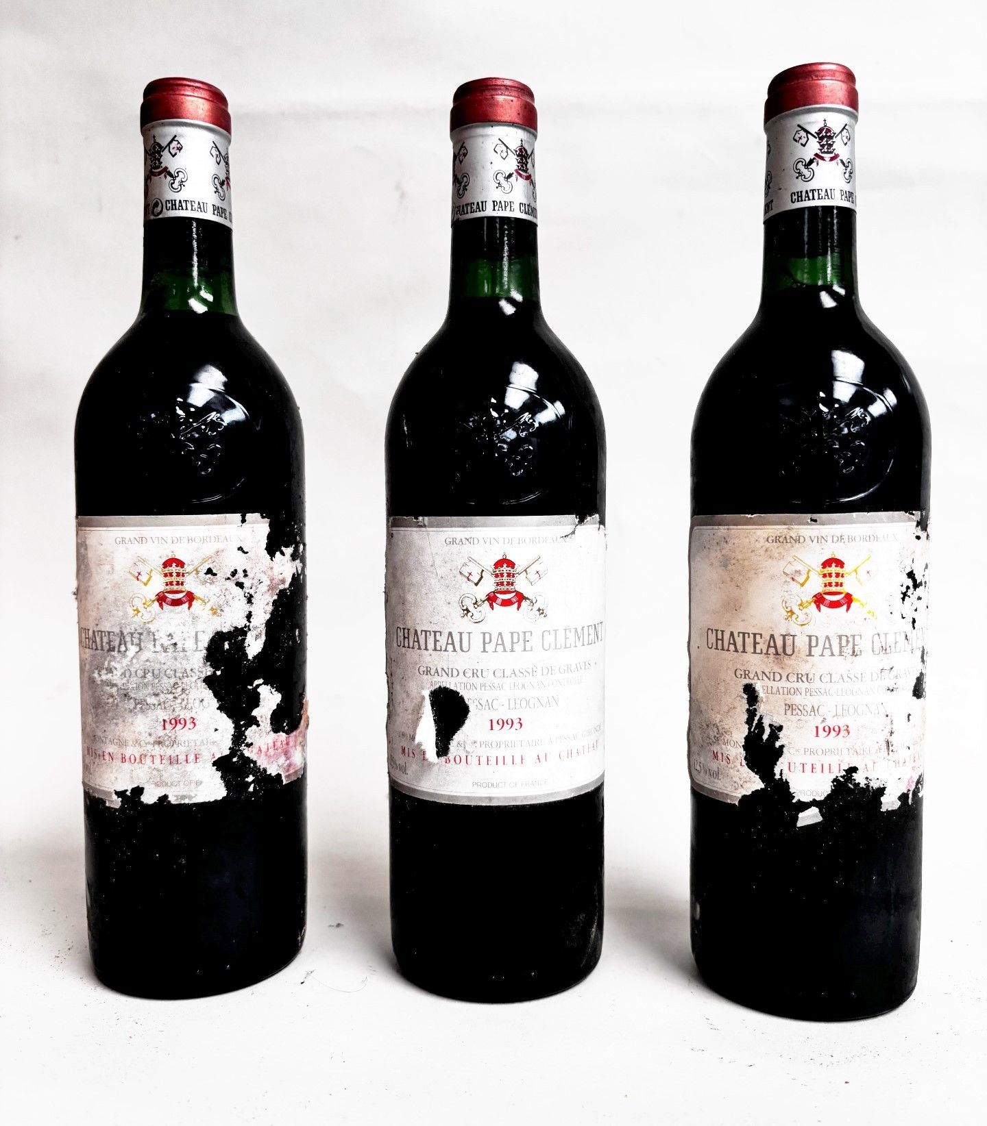 3 Bottles Château PAPE CLÉMENT - Gc de Graves Pessac Leognan 1993 Damaged labels.