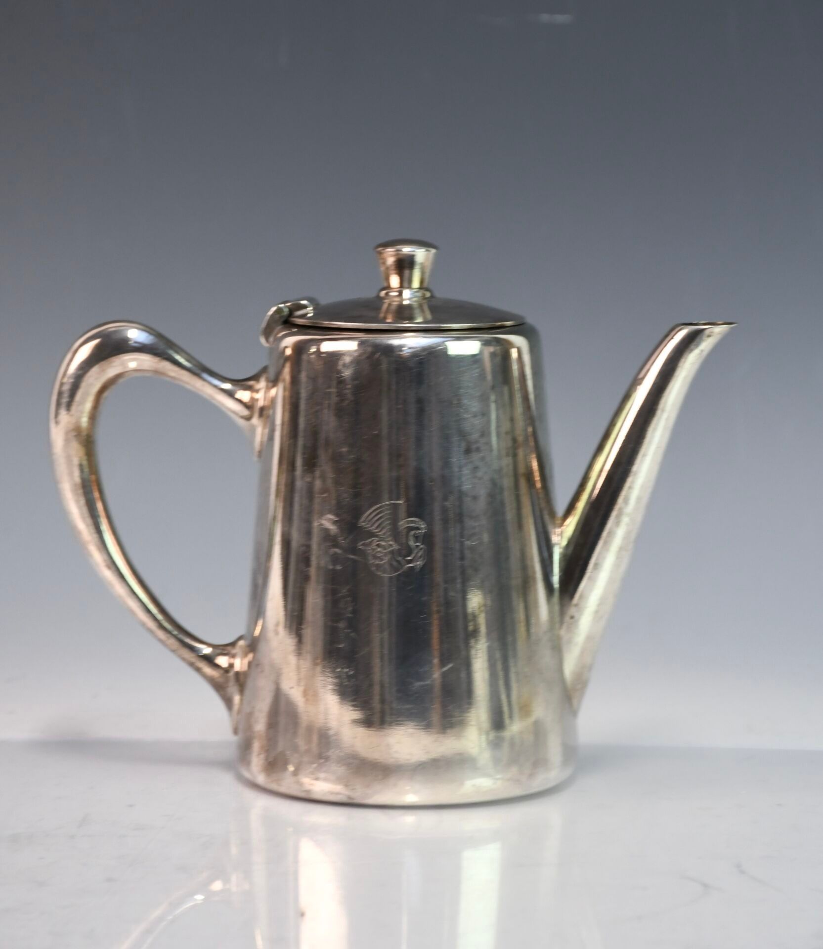 Silver plated coffee pot engraved with a winged seahorse.