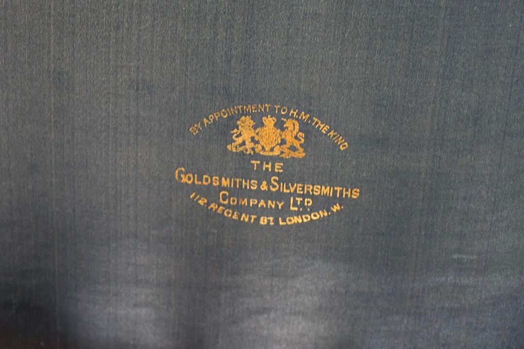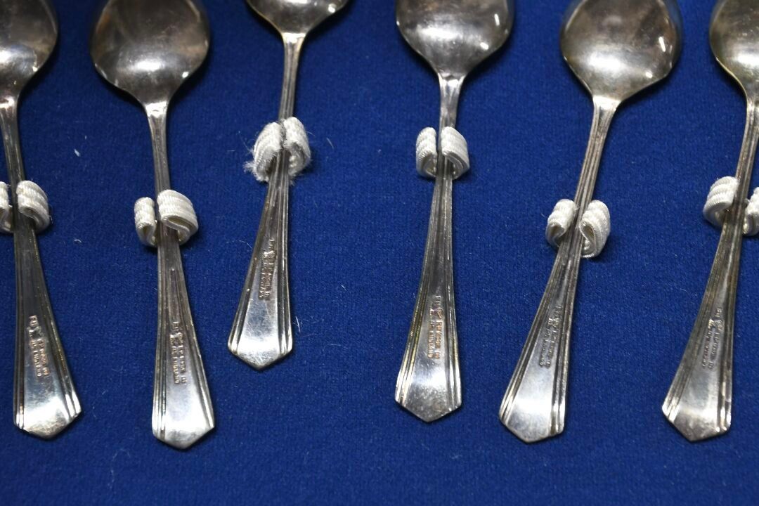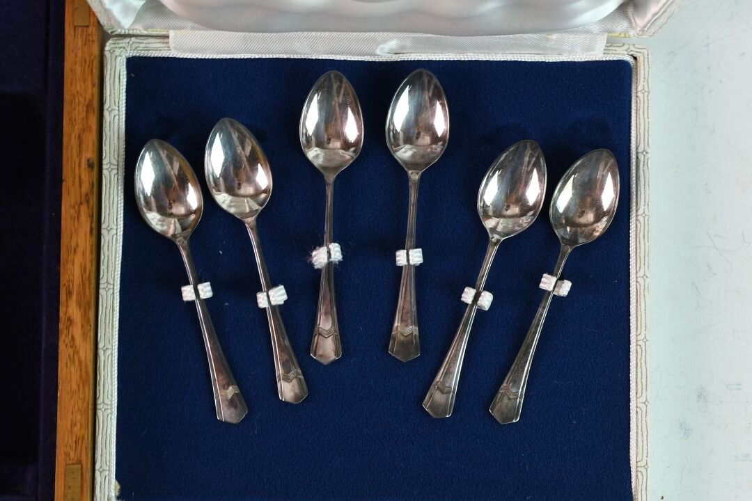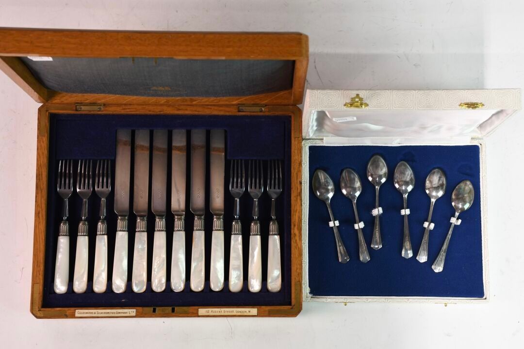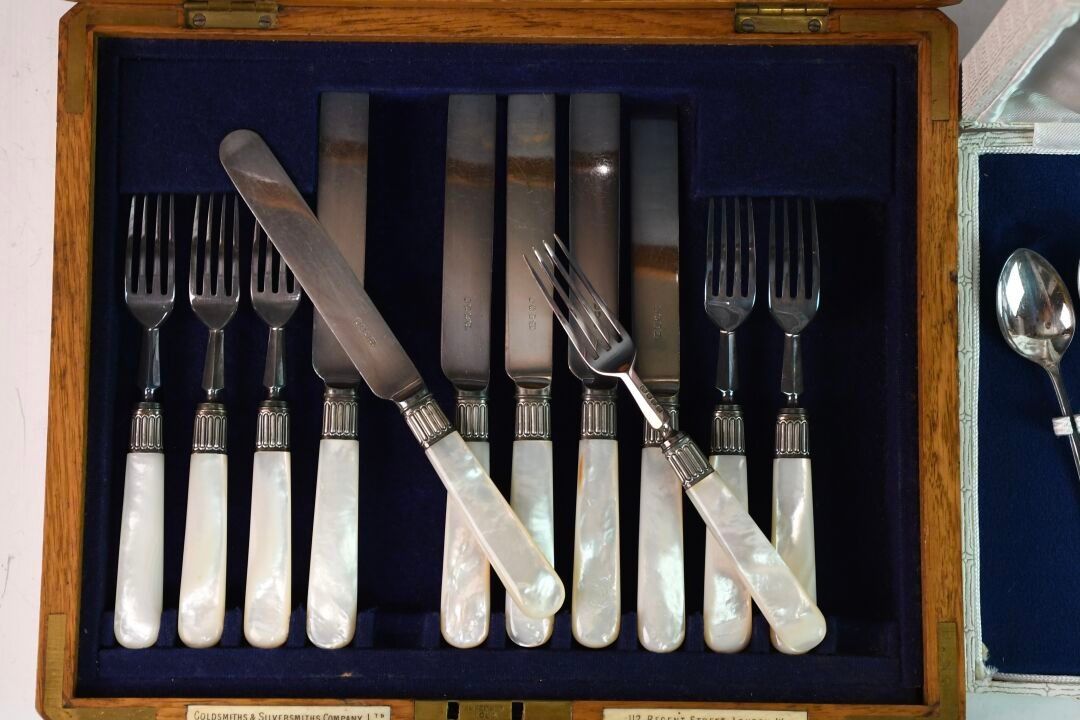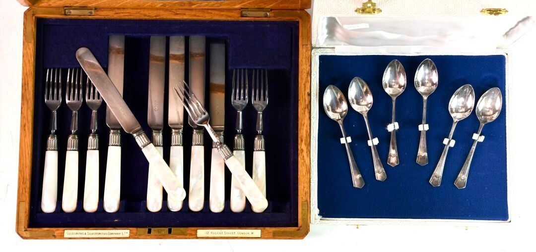 Reunion of a suite of six silver plated knives and six forks with mother of pearl handles in an oak box from GOLDSMITHS & SILVERSMITH COMPANY Ltd in London and a suite of six small silver plated spoons Art Deco style.