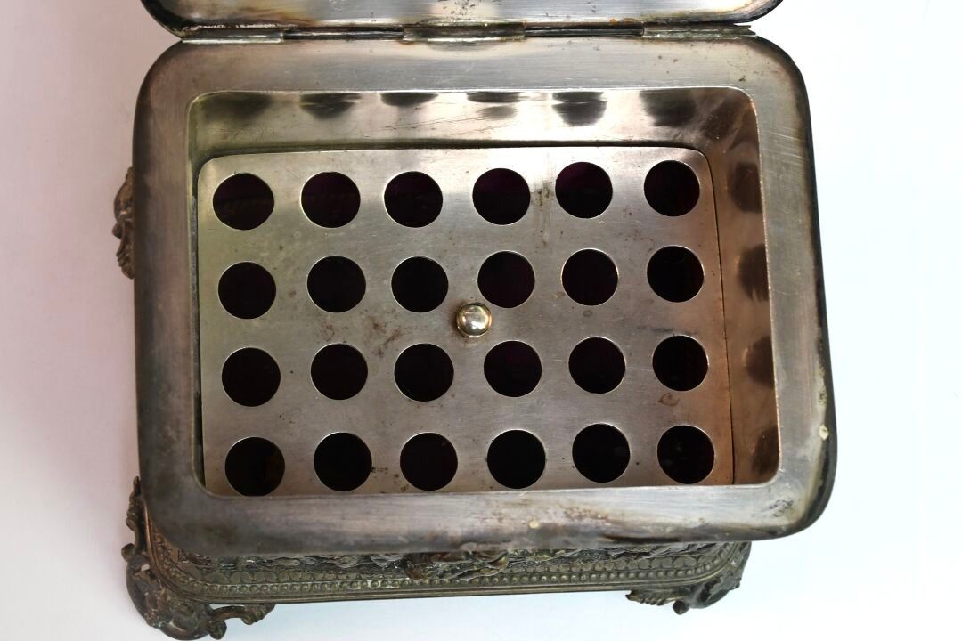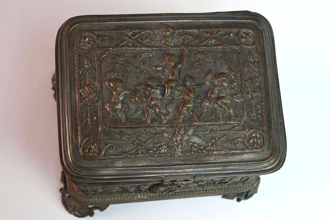 A silver-plated cigar box decorated with bacchanalian scenes.