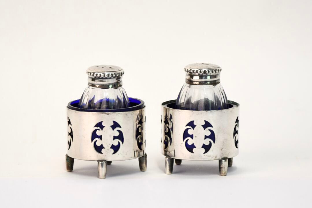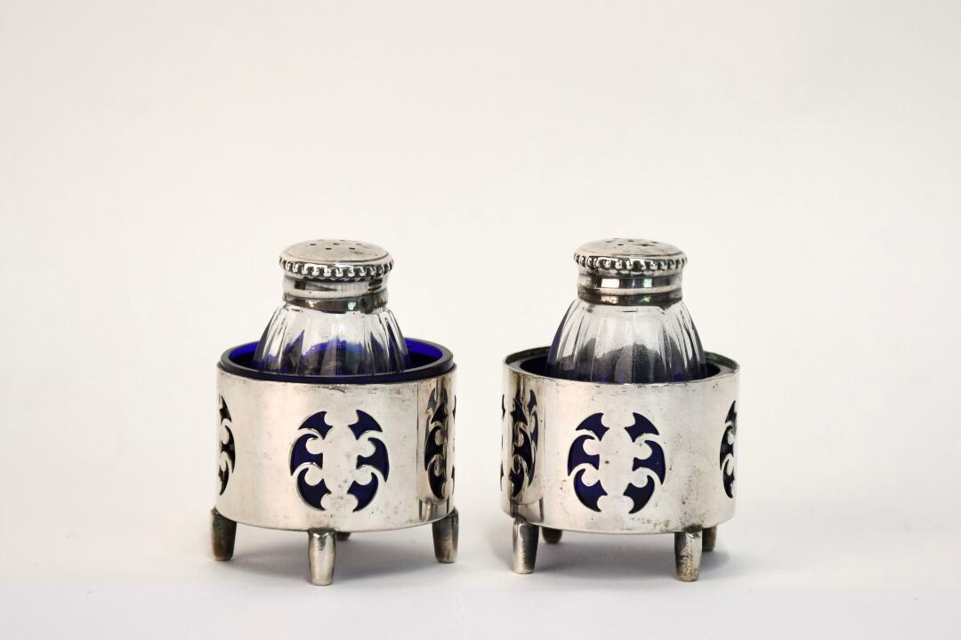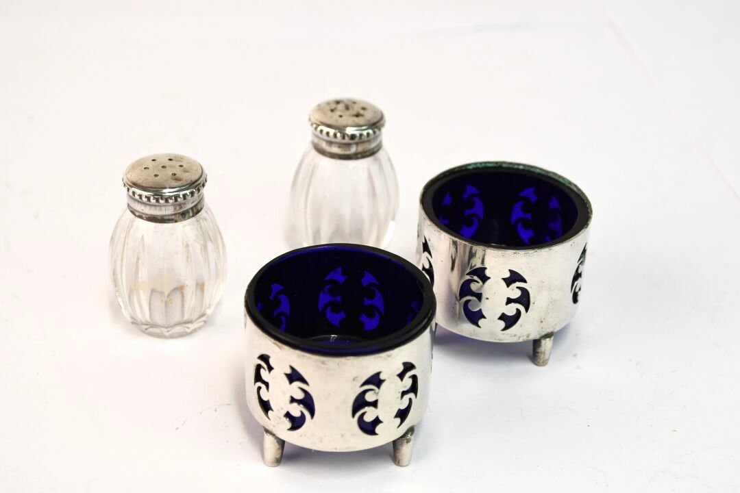 Reunion of a pair of silver and moulded crystal salerons 800/1000, a pair of openwork silvered metal salerons and blue glass interior