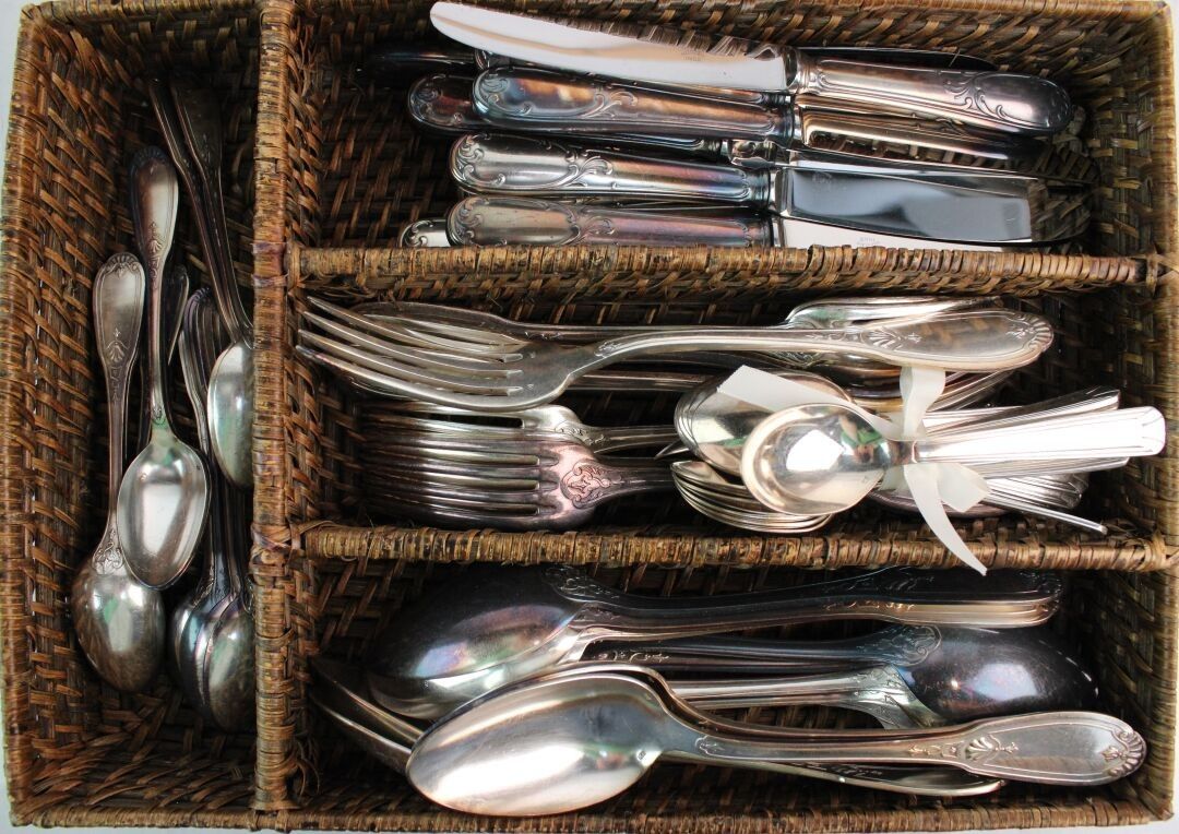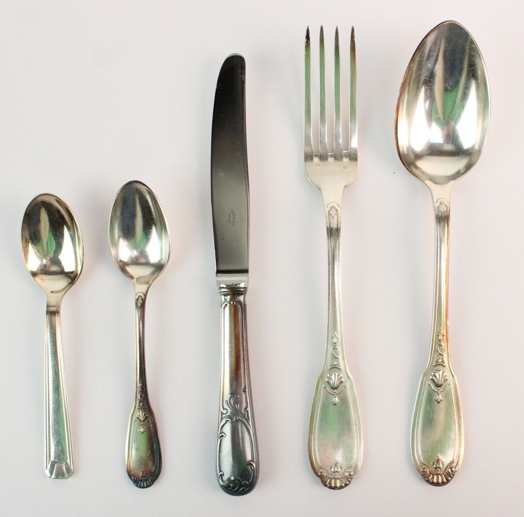 Reunion of a set of silver-plated cutlery with shell decoration, including twelve small spoons and twelve pieces of cutlery, twelve small silver-plated spoons (1930s style) and twelve silver-plated entremet knives (Louis XV style) with stainless steel blades.