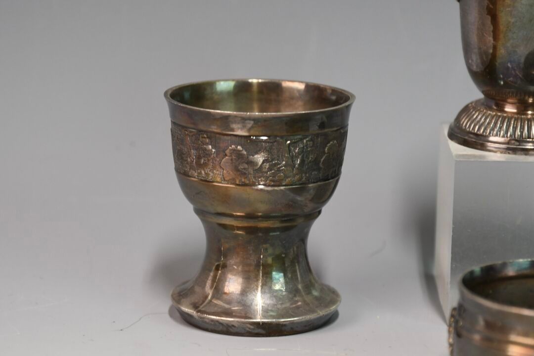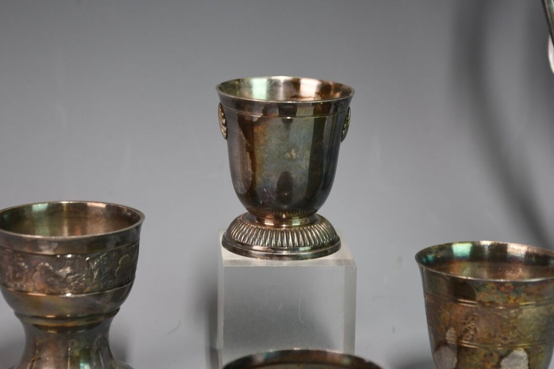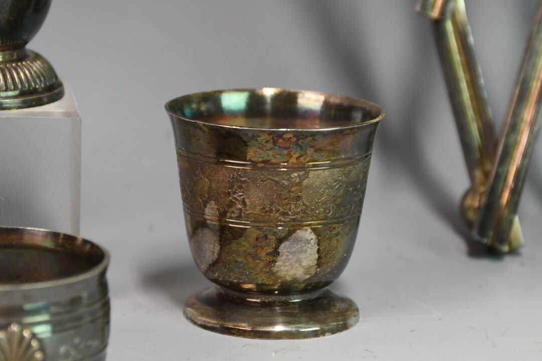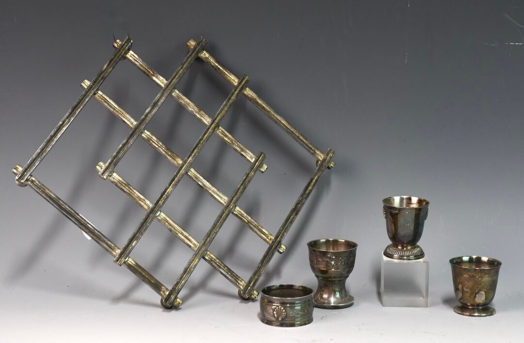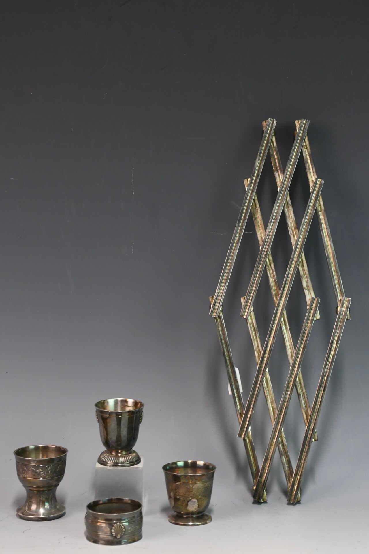 Set of three silver-plated eggcups, a napkin ring and a folding trivet.