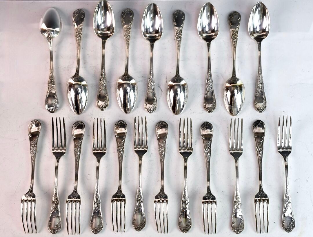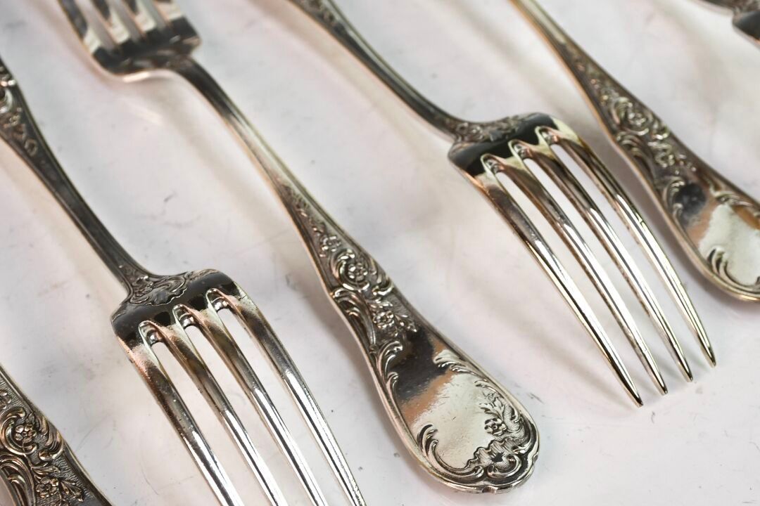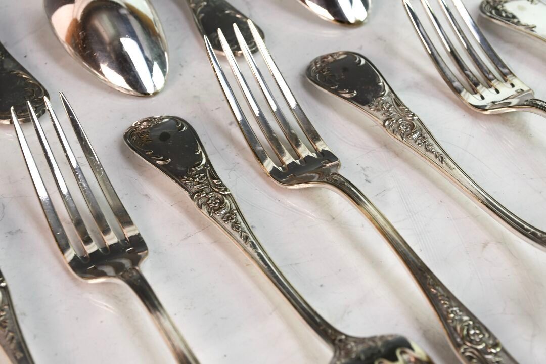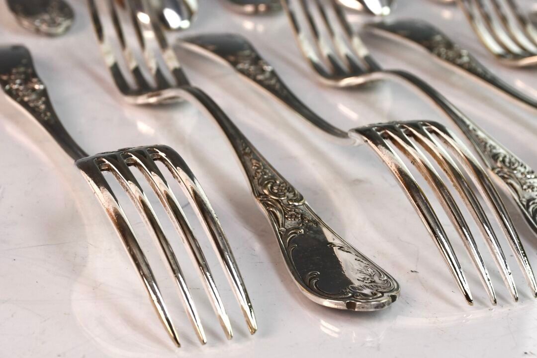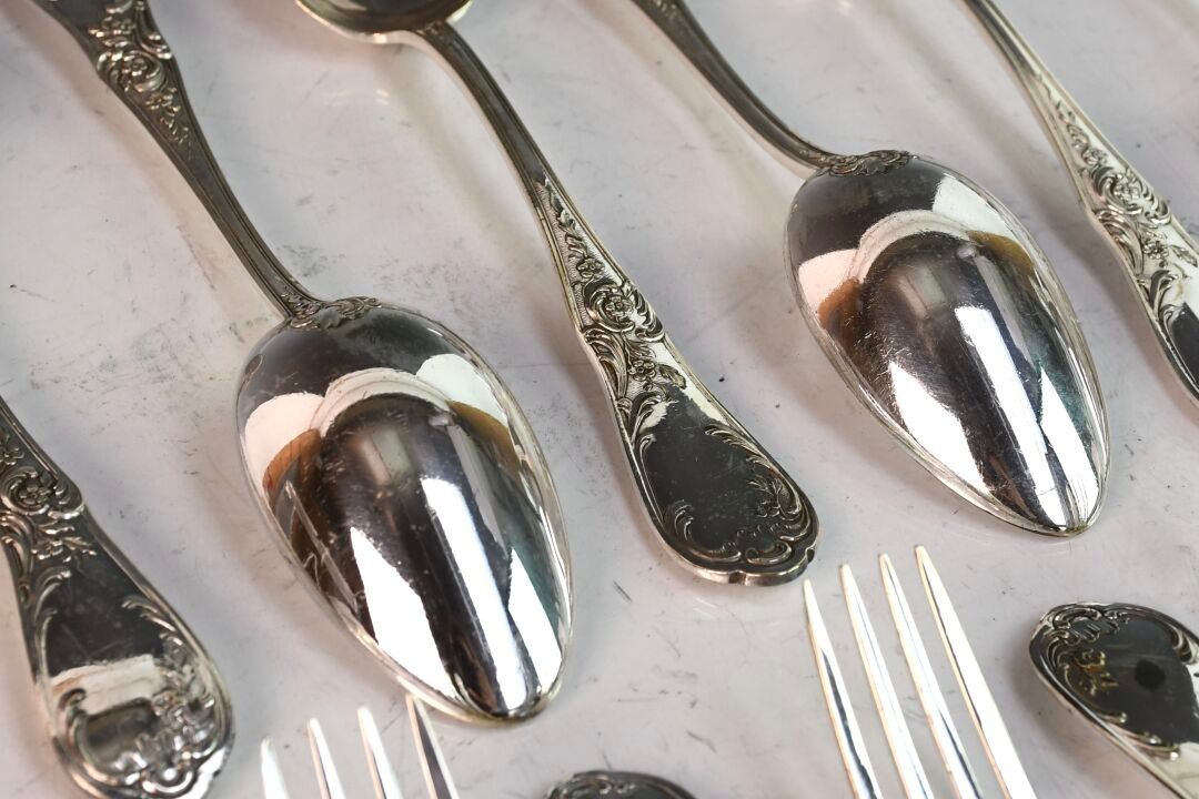 Suite of nine silver-plated soup spoons and twelve table forks in the Louis XV style (good condition)