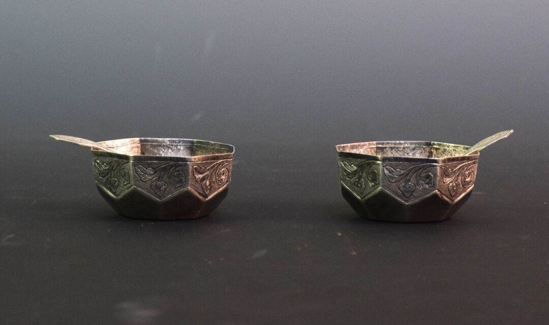 Pair of silver 800/1000 octagonal salad bowls with floral decoration, with their scoop