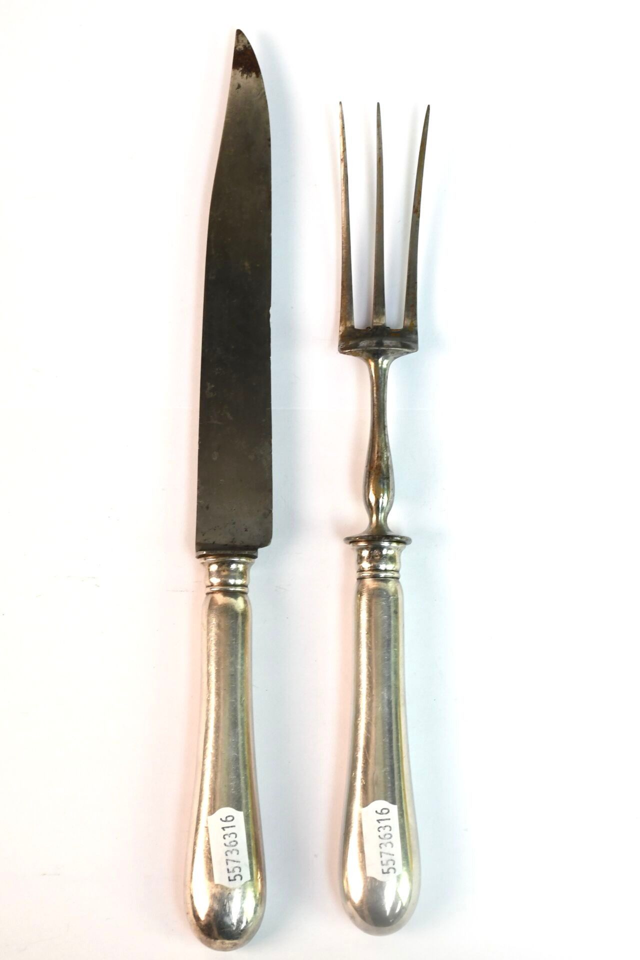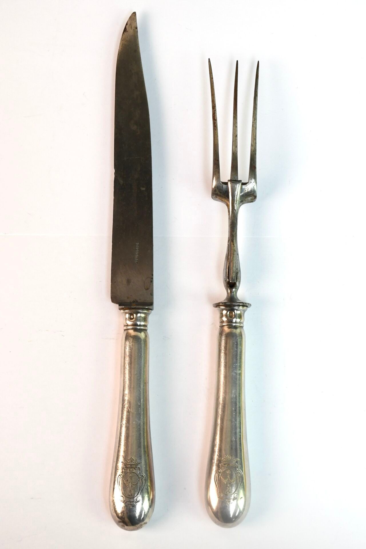 Sterling silver leg of lamb cutlery with handle engraved with a coat of arms. (minor oxidation)