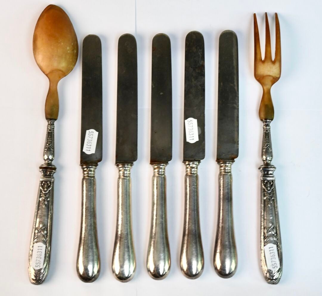 A set of five knives with forged silver handles decorated with a medallion and engraved TF, steel blade.