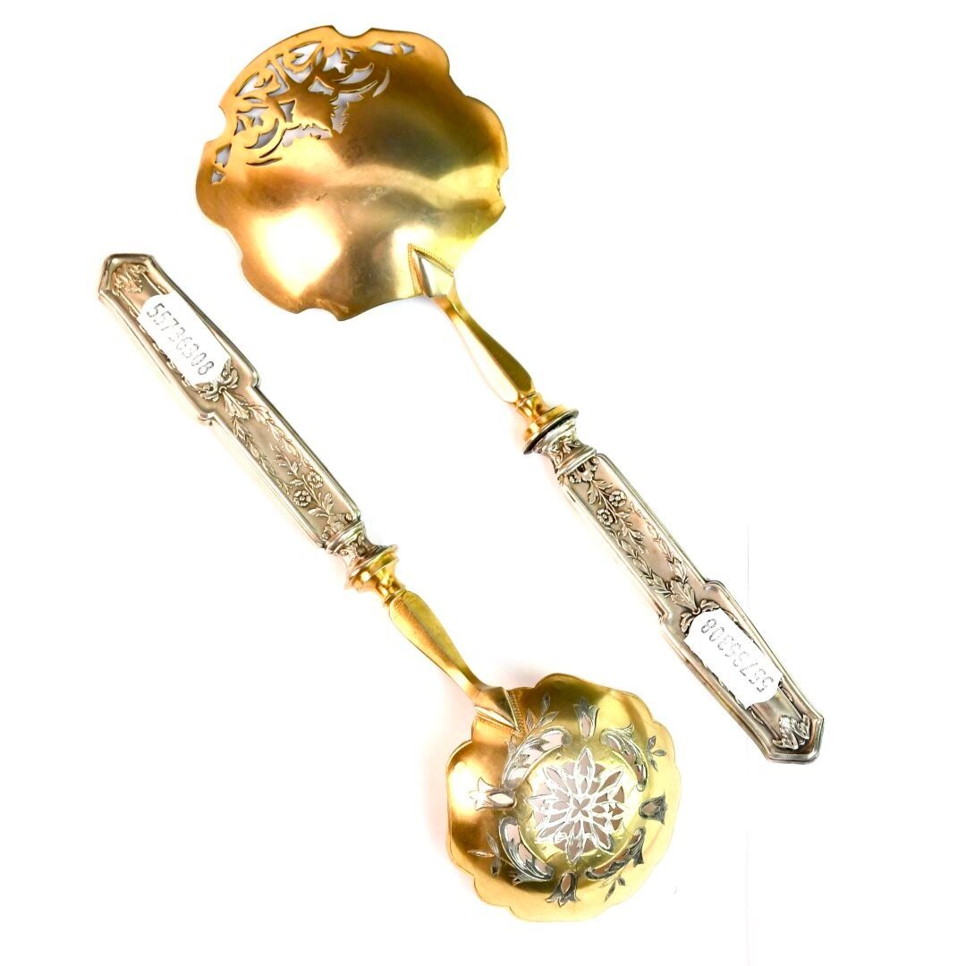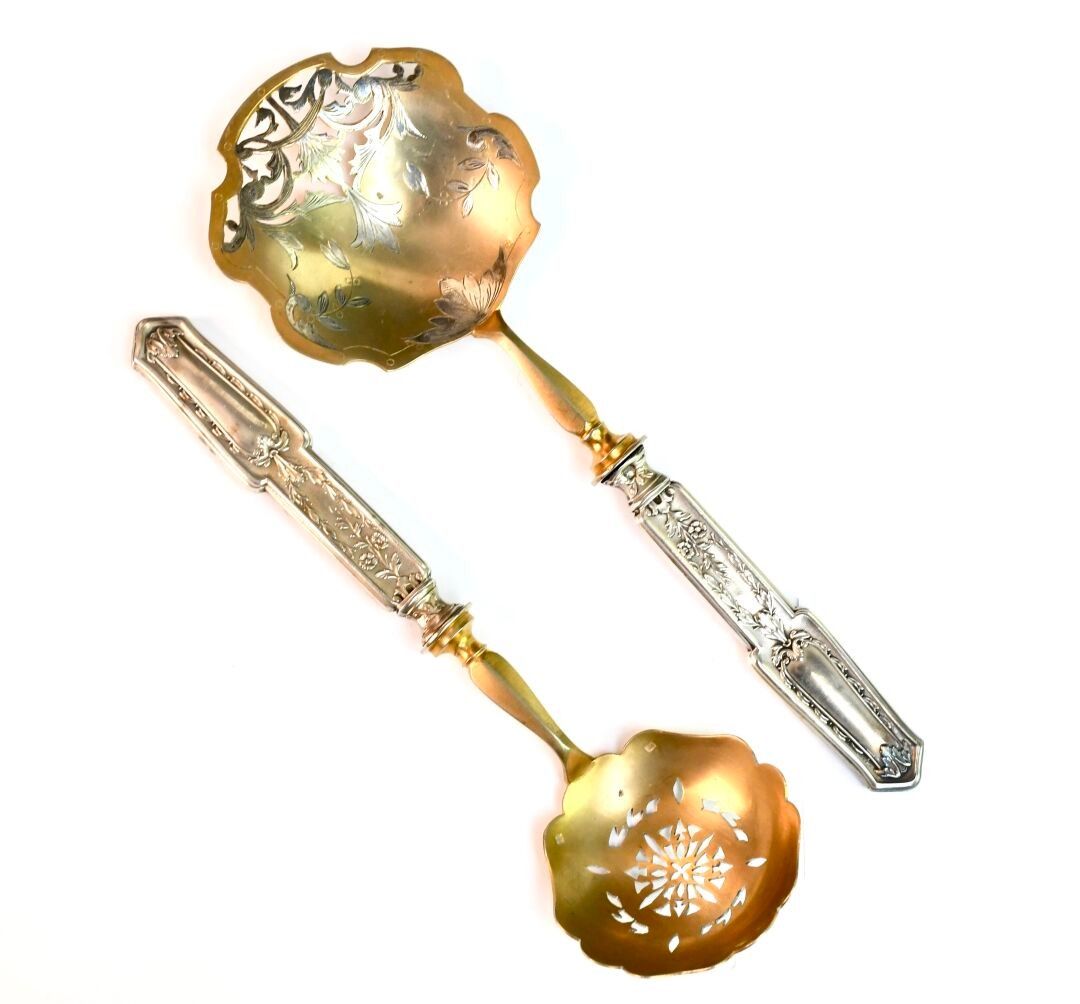 Suite of a strawberry scoop and a sprinkling spoon, Louis XVI style, with forged silver handles and gilt and silver spoons with openwork foliage.