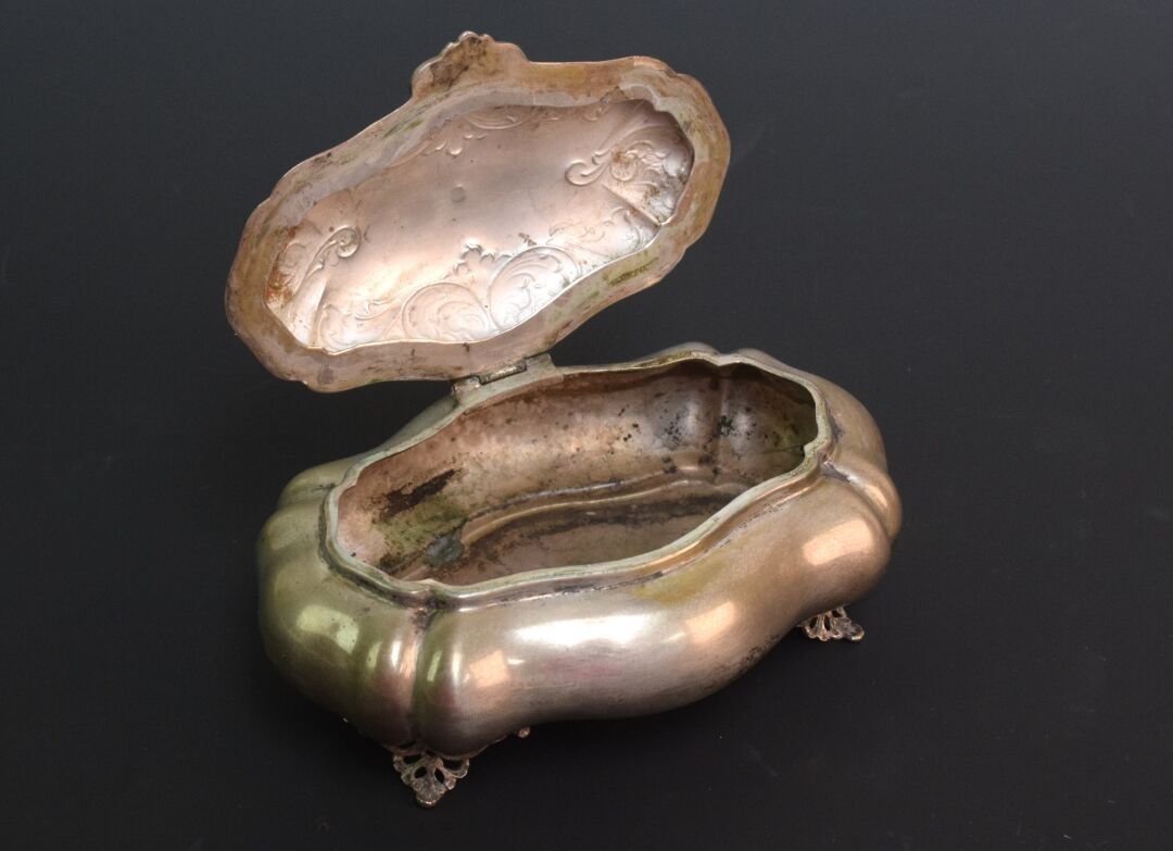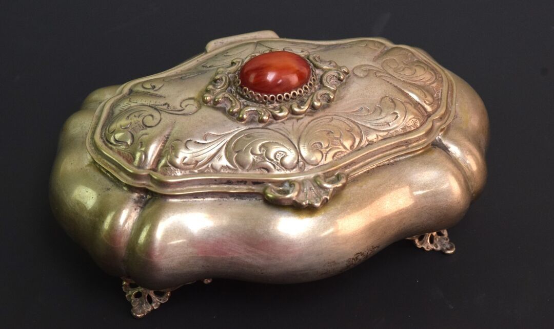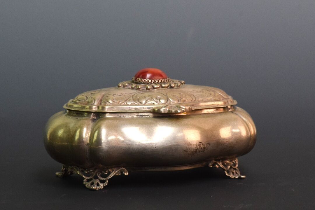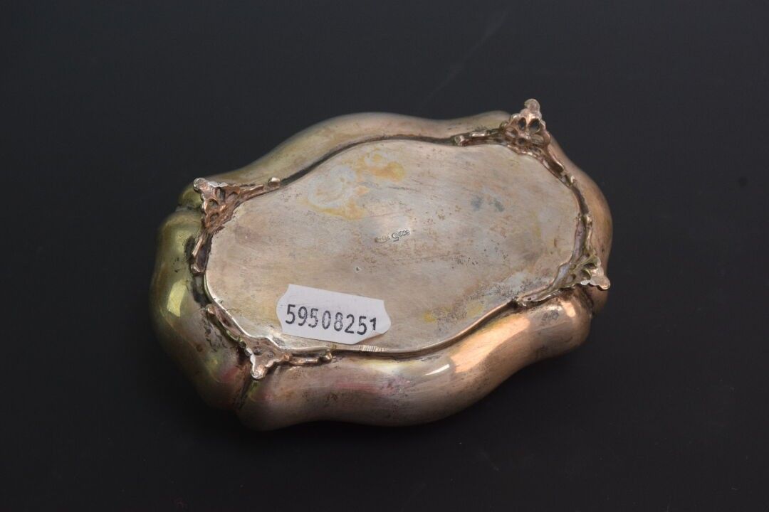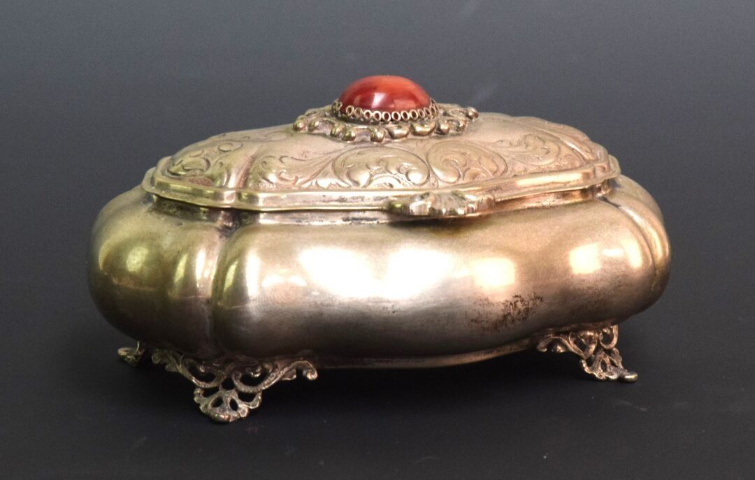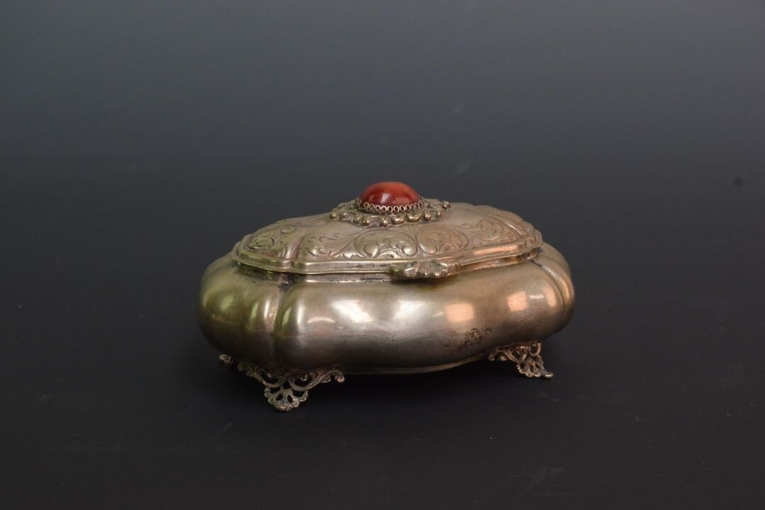 An oval silver box 800/1000 with a chased lid topped with a cabochon. It stands on four small openwork feet.