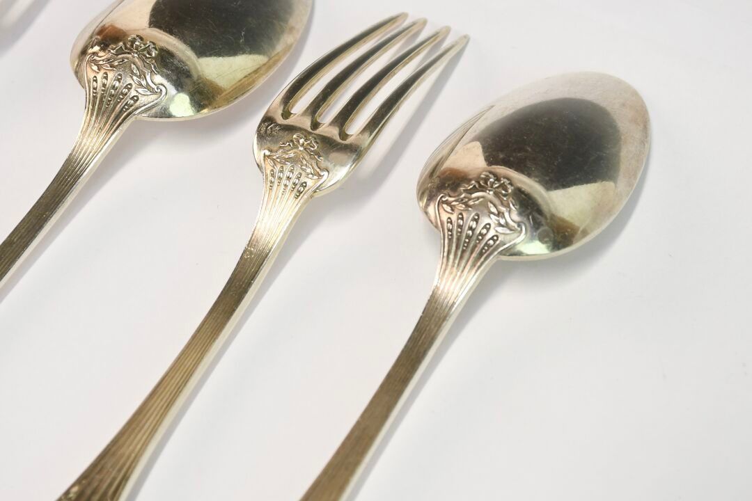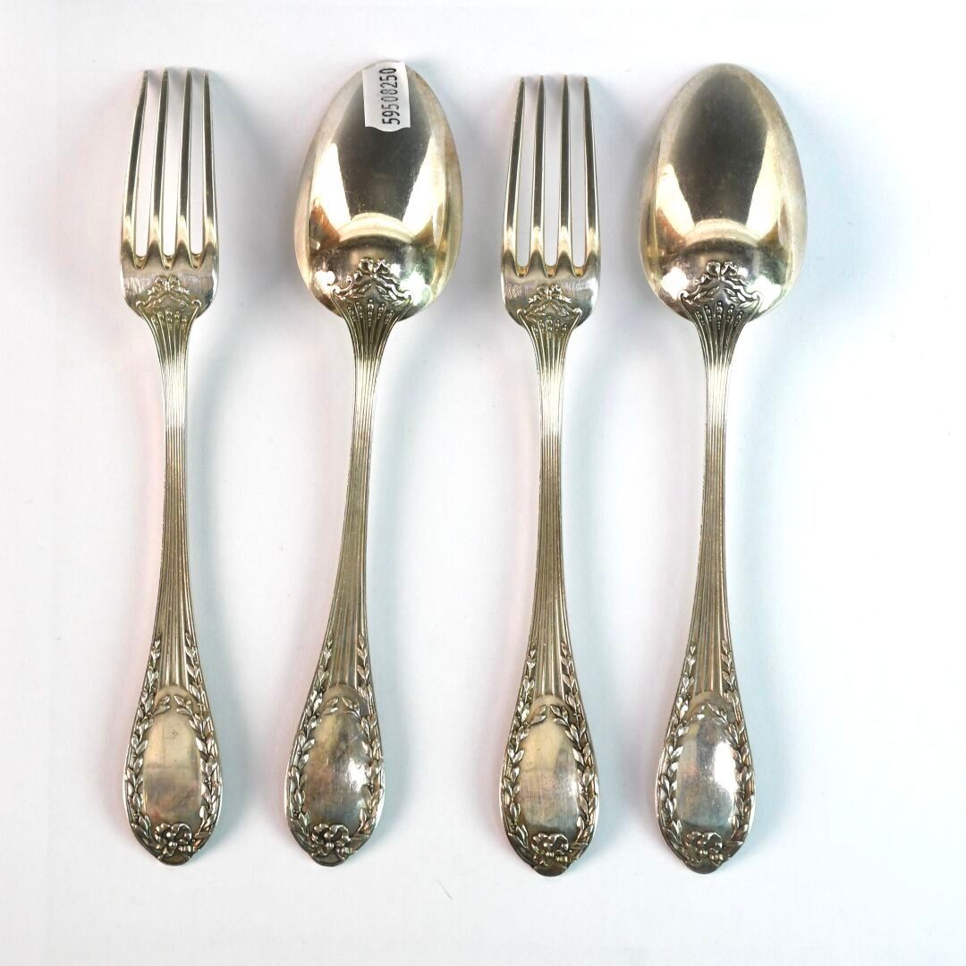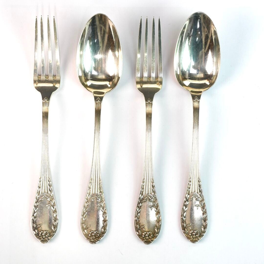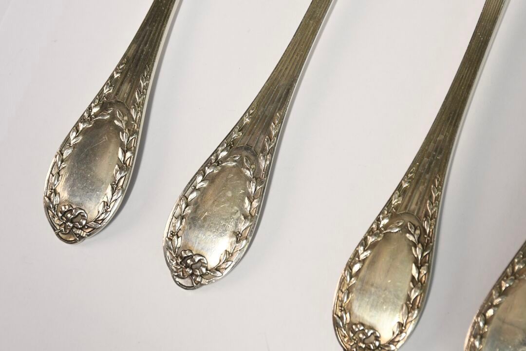 Two silver table settings with spatula chased with laurel leaves and a bow,