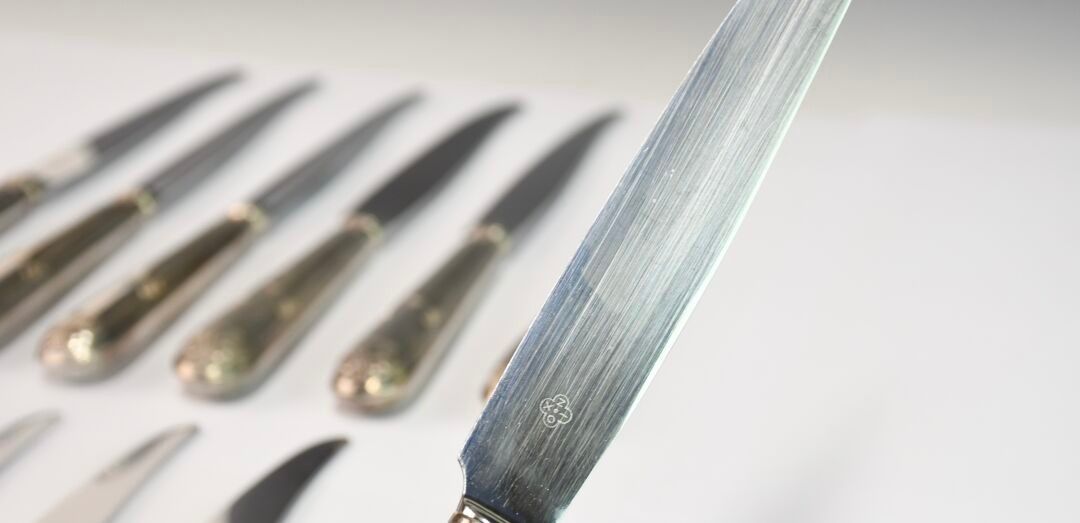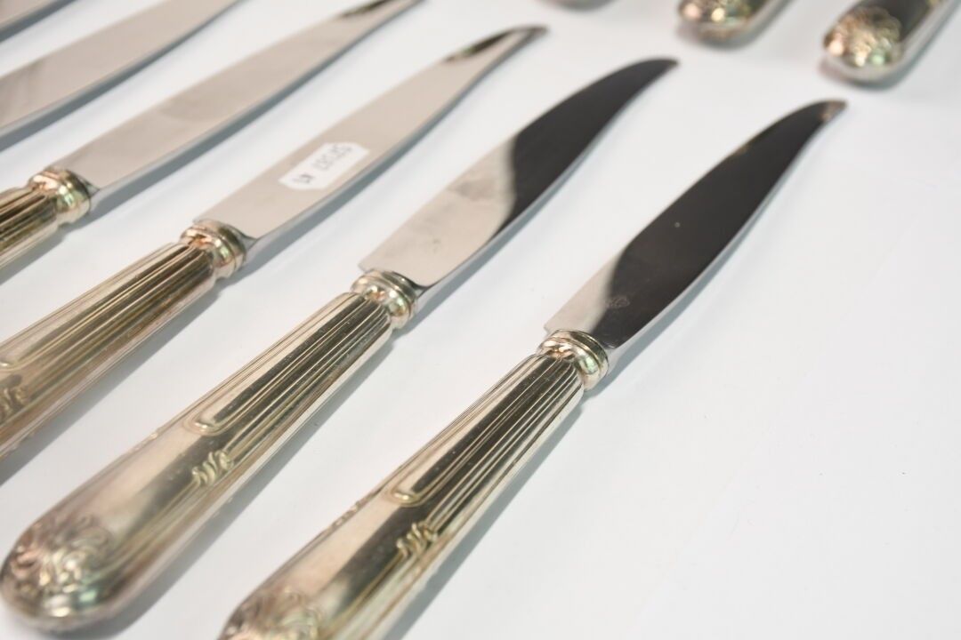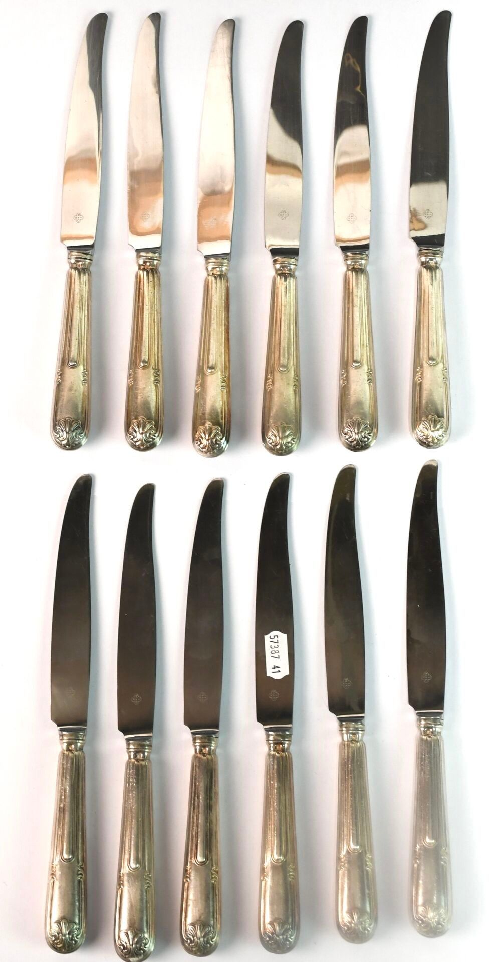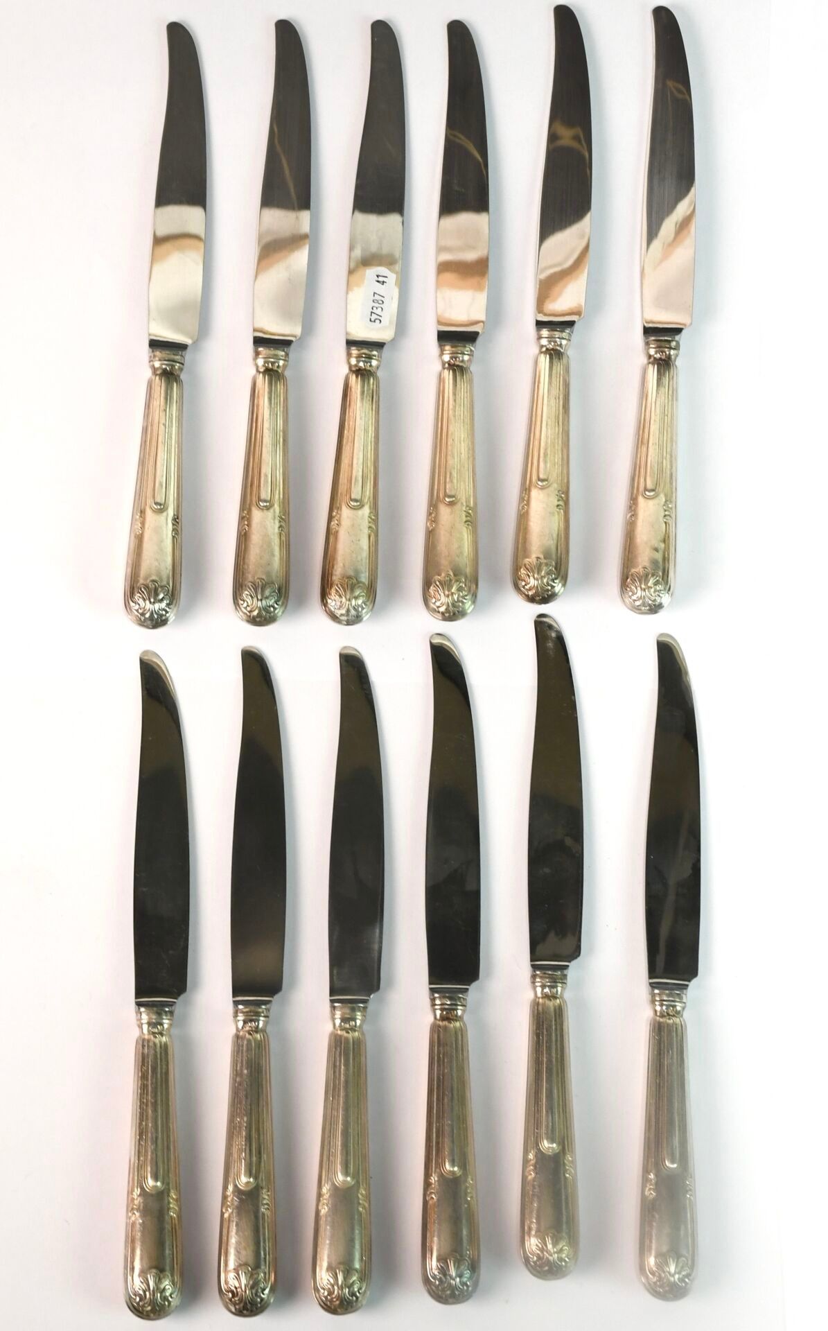 Set of 12 knives with forged silver handles decorated with stylised shells, stainless steel blade.